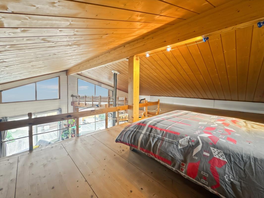 La maison, au style chalet en bois affirmé, développe environ 80 m² habitables, et se compose d'une grande pièce de vie lumineuse avec baies vitrées donnant sur la terrasse, une cuisine ouverte, une salle de bains avec douche, un wc indépendant, deux chambres , le tout complété par un dortoir d'environ 40 m², idéal pour accueillir famille ou invités. En rez-de-jardin, un vaste garage d'environ 80 m², correspondant à l'emprise de l'habitation, intègre un cuisine, un garage, une cave, un point d'eau avec wc, ainsi qu'un espace laverie, apportant une fonctionnalité appréciable.
