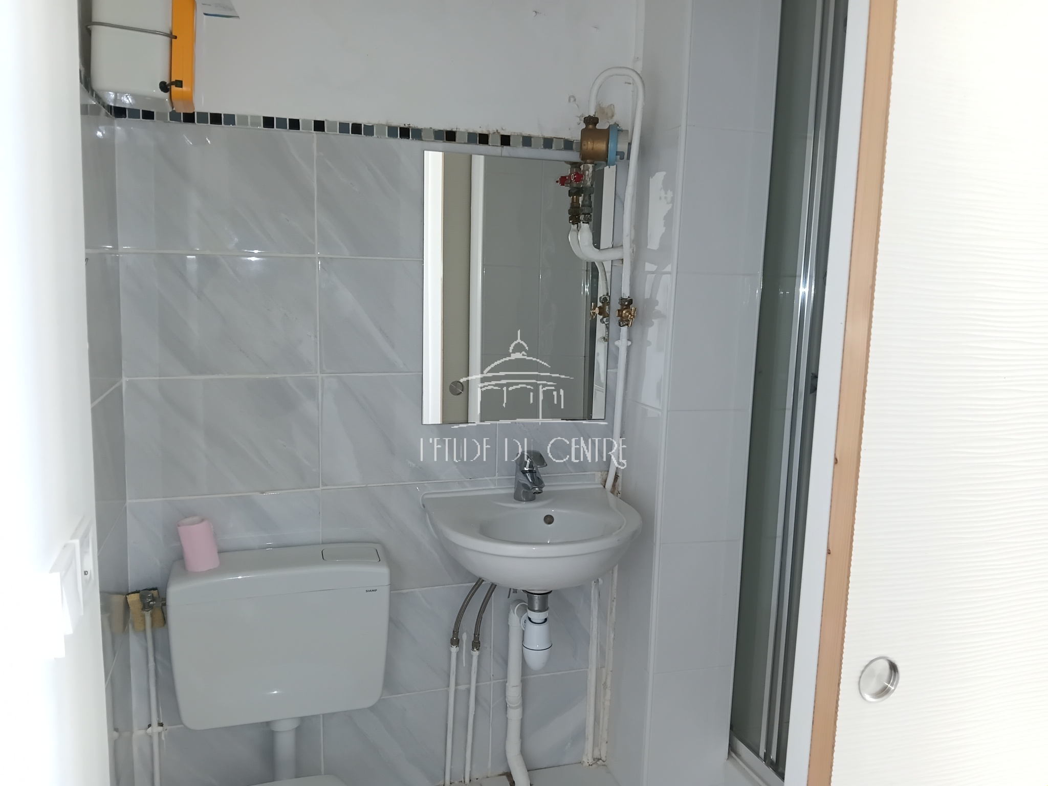 Un appartement F1, comprenant : une pièce principale, une cuisine séparée et une salle d'eau avec WC.