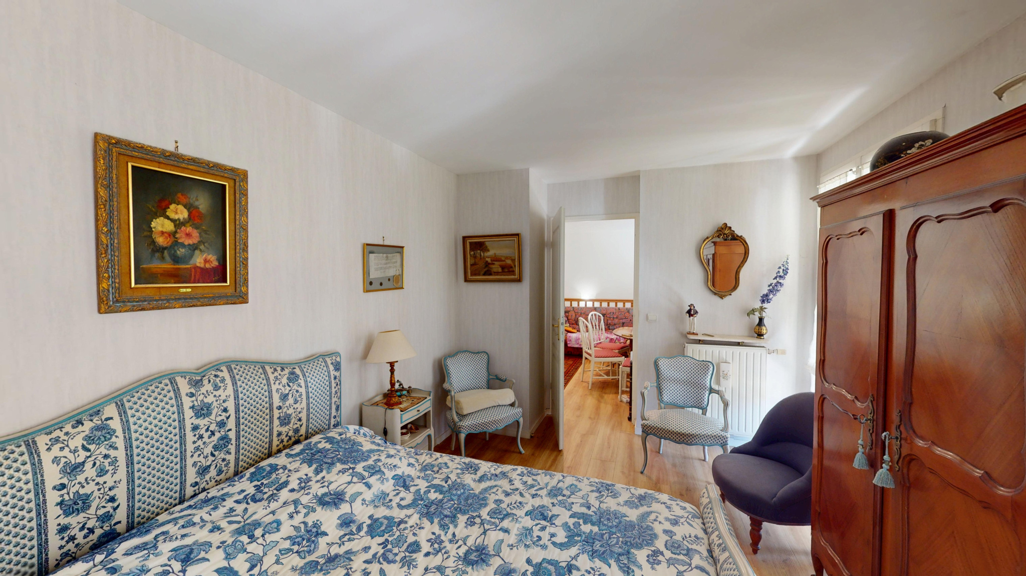 À l'étage, une mezzanine d'environ 11 m2 dessert deux chambres confortables, une salle de bains et un second WC. Cet agencement offre une séparation entre les espaces de vie et de nuit.