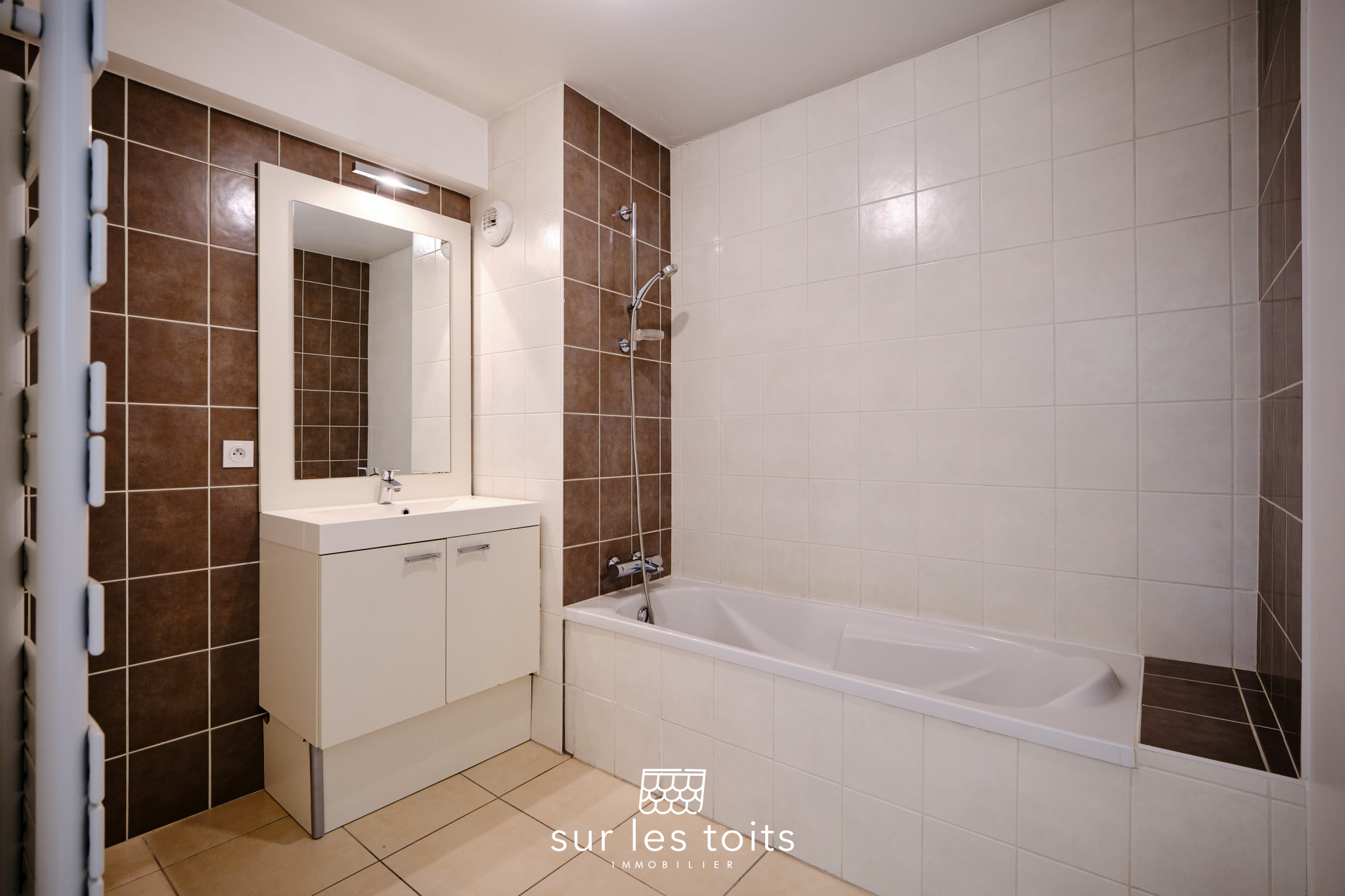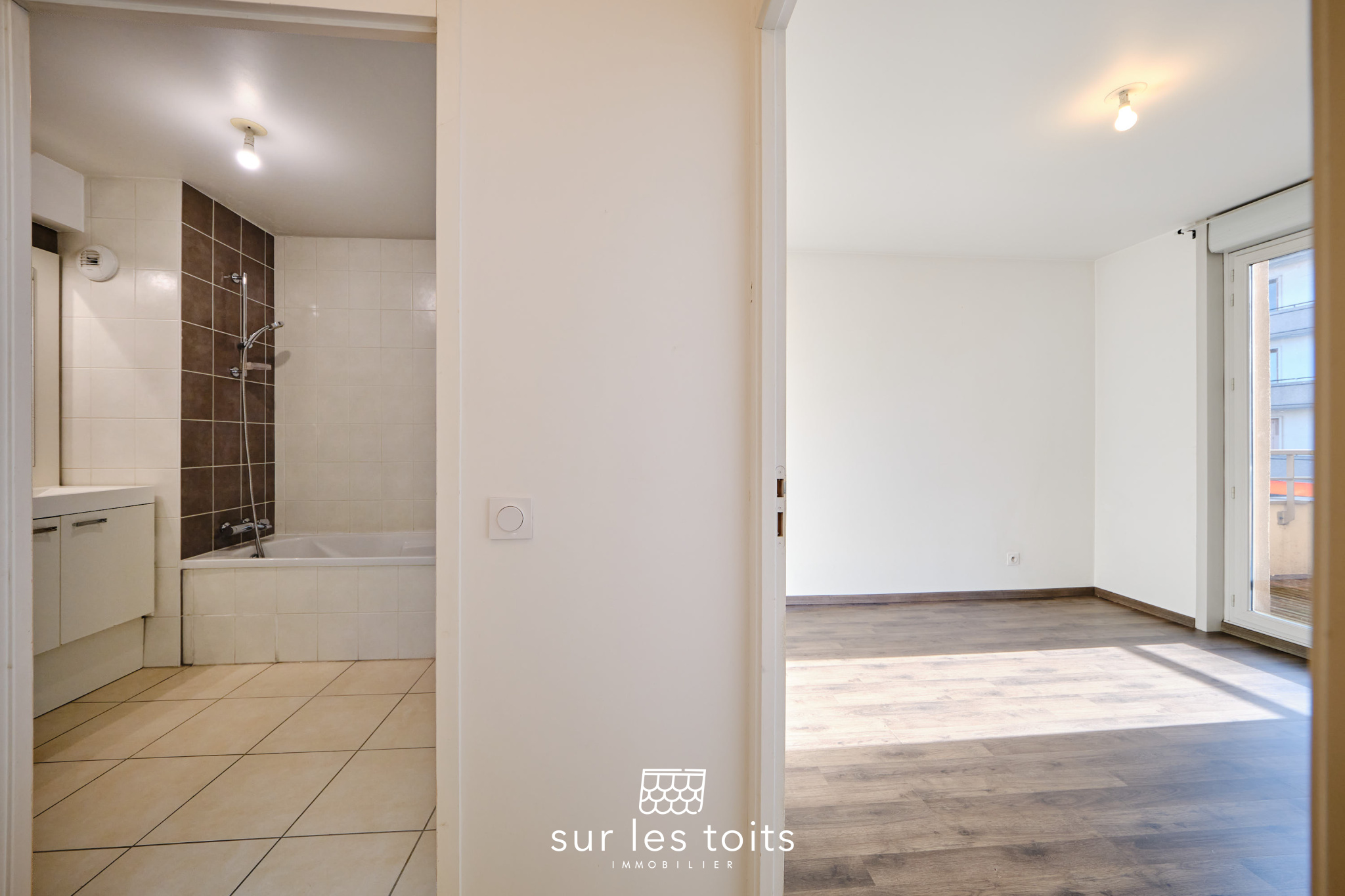 L'entrée, spacieuse et fonctionnelle, dispose d'un placard intégré ainsi que d'un couloir pouvant accueillir un espace bureau ou un couchage d'appoint. Elle mène à une grande pièce de vie lumineuse, ouverte sur une terrasse d'environ 10 m2, un véritable atout en centre-ville. La cuisine Mobalpa équipée est ouverte sur le séjour et bénéficie d'une exposition plein Sud.