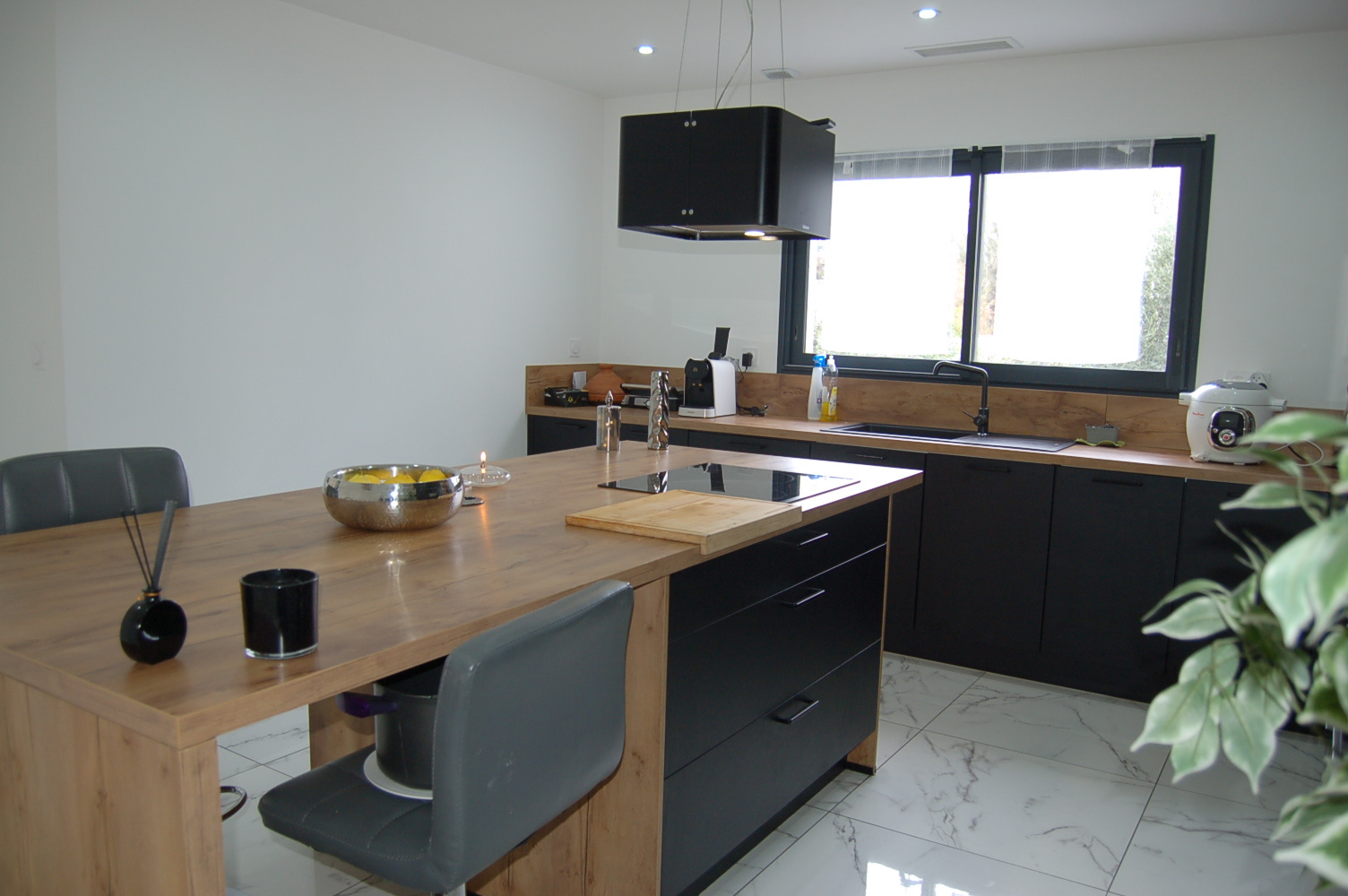 La cuisine contemporaine haut de gamme toute équipée avec ilôt central est jouxtée à la salle à manger.