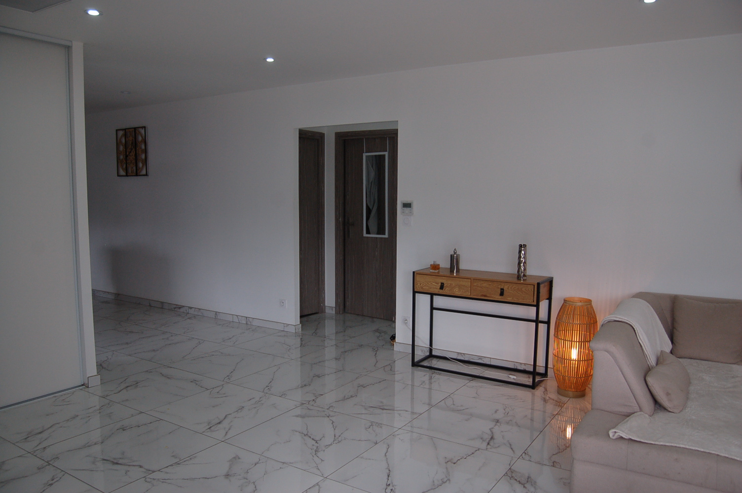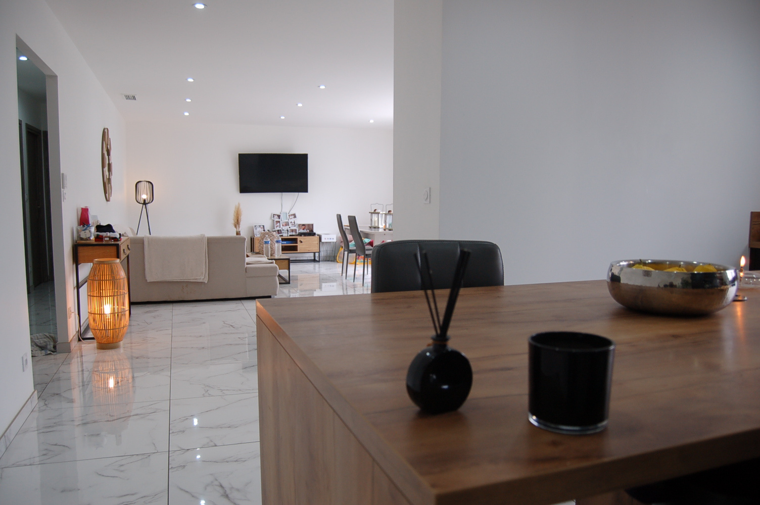 Quand vous ouvrez la porte d'entrée vous êtes agréablement surpris par le volume et la lumière qui baigne dans ce salon, salle à manger de plus de 45 m2.