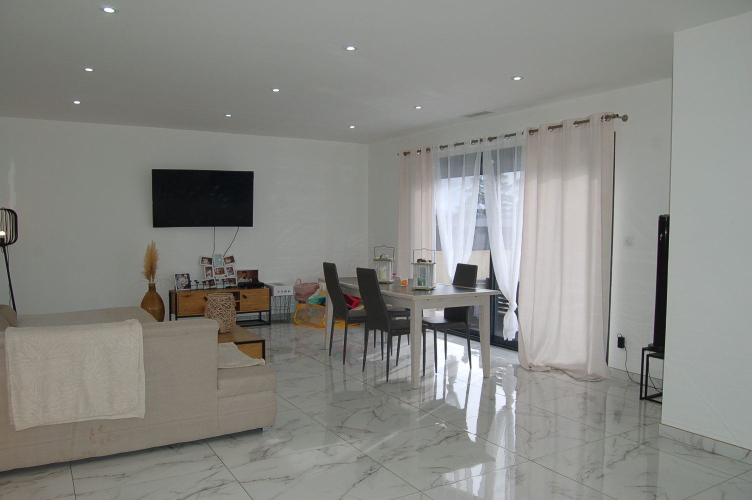 Quand vous ouvrez la porte d'entrée vous êtes agréablement surpris par le volume et la lumière qui baigne dans ce salon, salle à manger de plus de 45 m2.