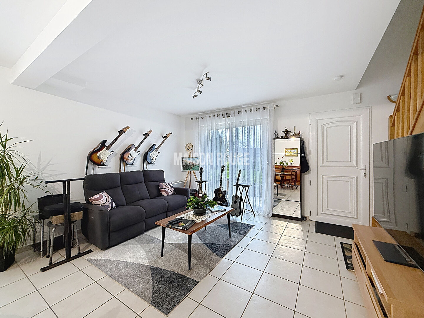Le rez-de-chaussée offre une entrée ouverte sur un lumineux salon-séjour, une cuisine aménagée et équipée (four, plaque vitrocéramique, hotte) ainsi qu'un WC séparé.