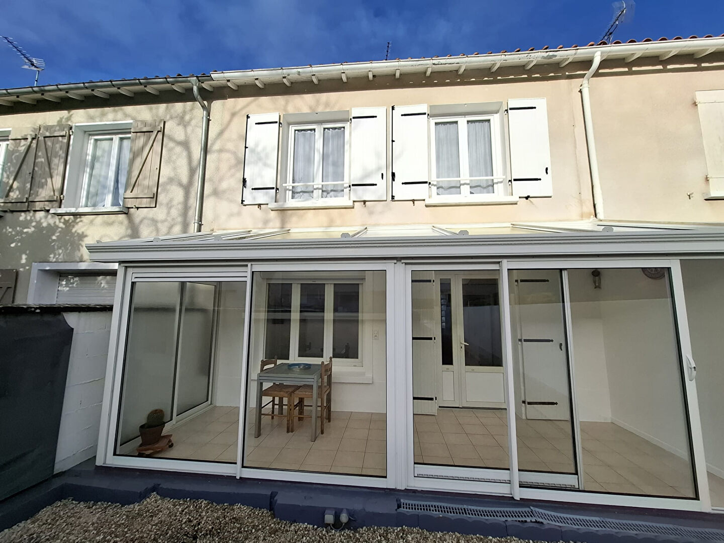 Une belle véranda donnant sur un jardin agréable avec garage.
