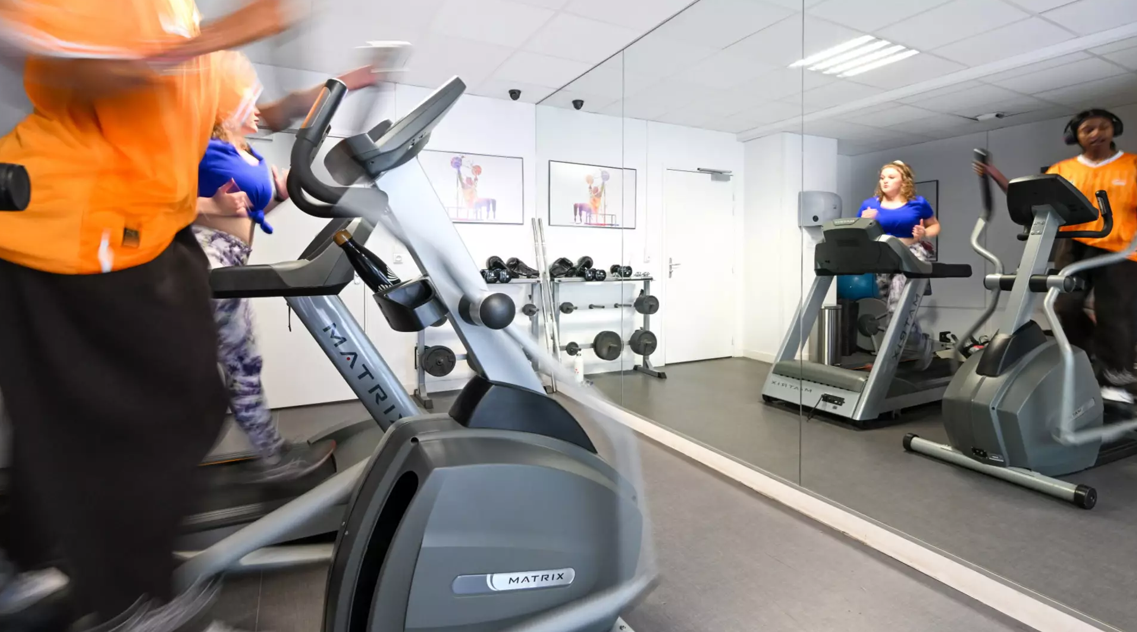 Résidence bien pensée avec salle de sport, espace de coworking et salle commune avec TV.