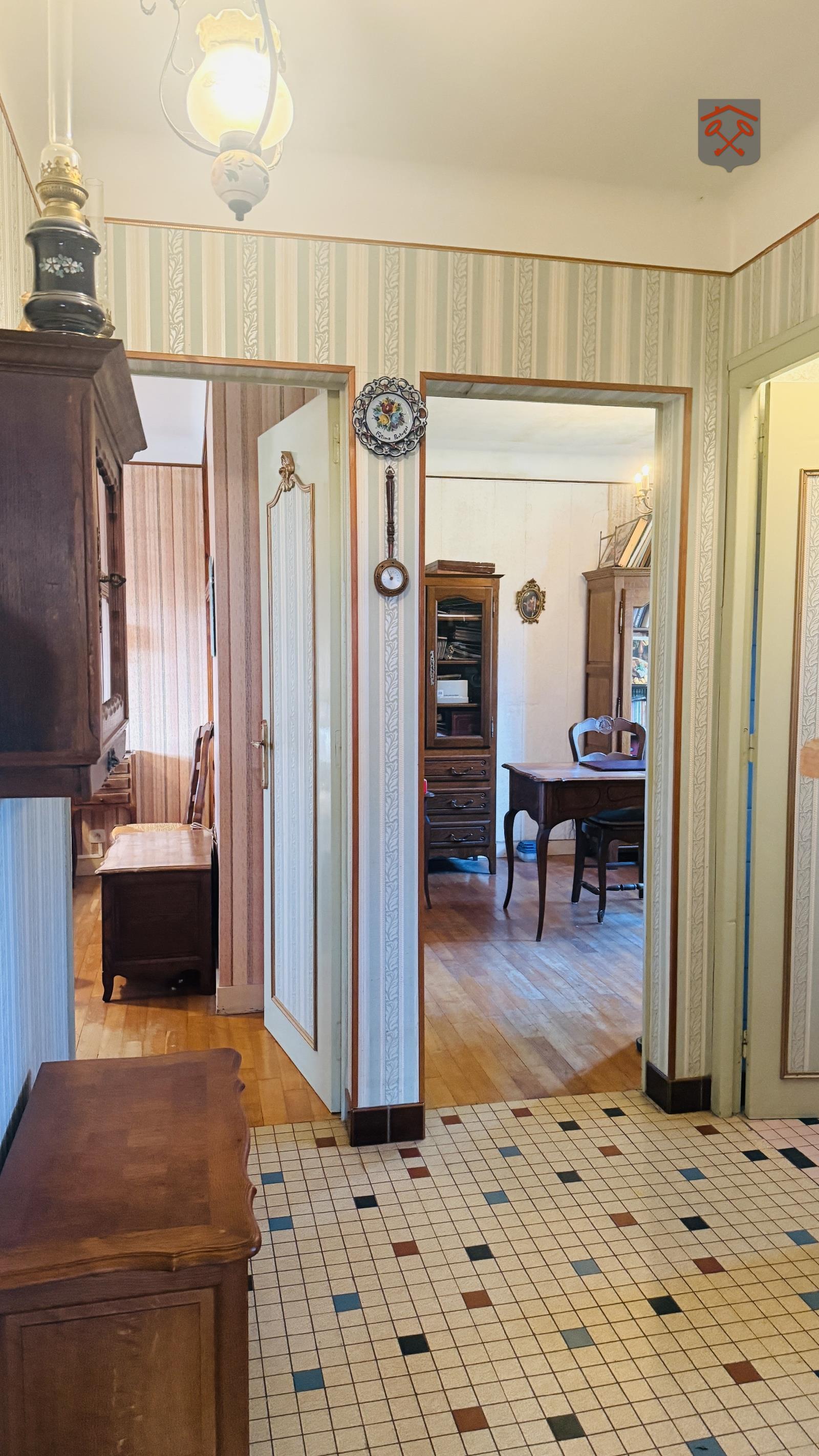 Entrée, séjour/salon avec cheminée insert ( 23 m²), cuisine, 2 chambres parquet, salle de bains, wc.