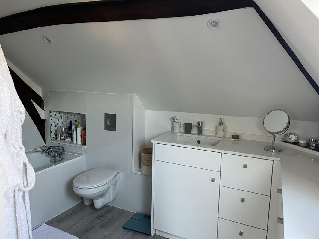 Au premier étage, trois chambres avec poutres apparentes dont une suite parentale avec sa salle de bain et une salle d'eau supplémentaire communicante aux deux autres chambres.