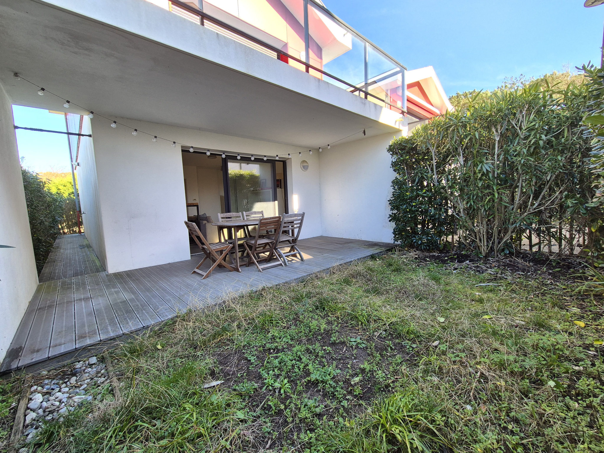 Il se compose d'une pièce de vie lumineuse ouvrant directement sur une terrasse prolongée par un espace jardin privatif, idéal pour profiter des beaux jours en toute tranquilité. Un cabanon, en annexe, vient compléter cet extérieur, offrant un espace de rangement pratique.
