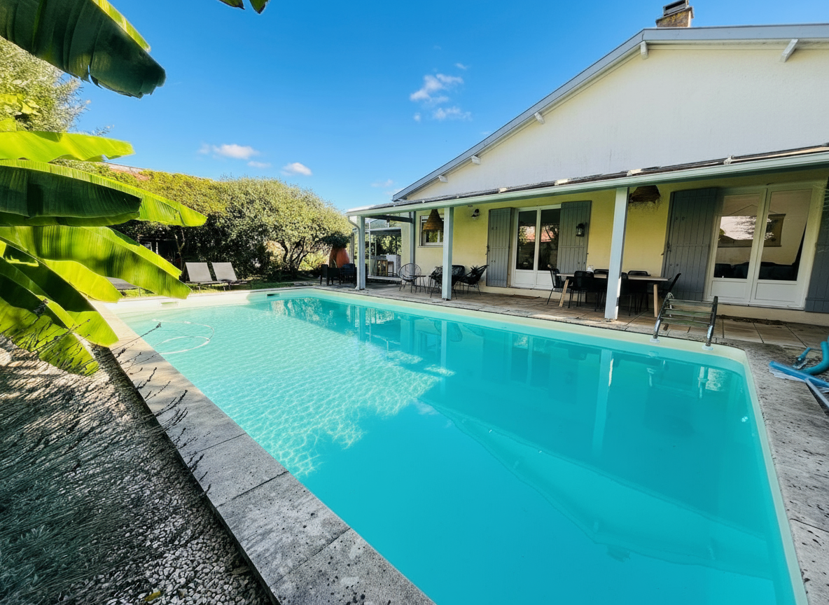 La maison, de plain-pied et en parfait état, ne nécessite aucun travaux. Elle se compose d'un salon lumineux avec cheminée, ouvert sur le jardin avec piscine, d'une cuisine aménagée dans une véranda, très agréable et baignée de lumière, ainsi que de trois chambres, d'une grande salle d'eau et d'une buanderie fonctionnelle.