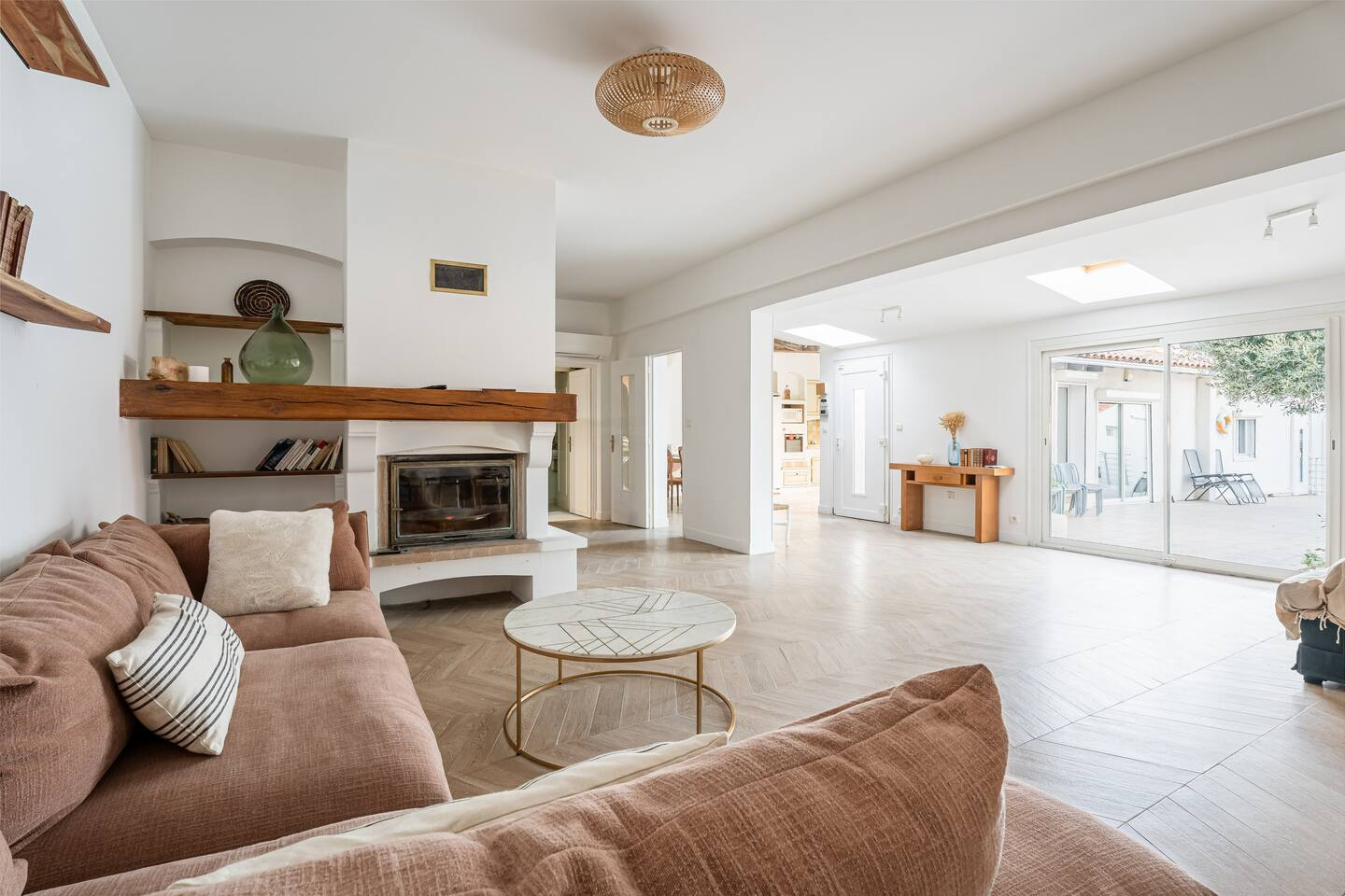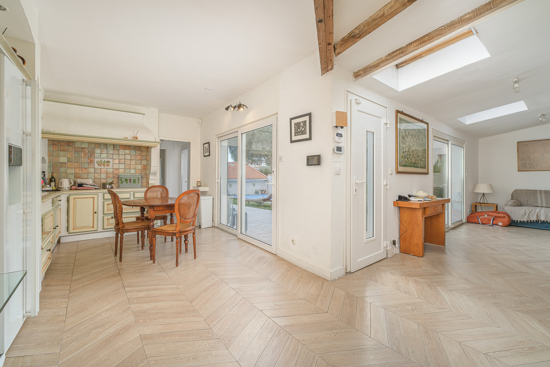 L'essentiel de la MAISON est de plain pied, tourné vers le JARDIN/piscine et le SOLEIL, telle une hacienda! Une grande et belle reception de presque 65m2 offre un LUMINEUX sejour et salle à manger avec cheminée. La cuisine contigue et ouverte offre un espace de repas supplémentaire. Toujours en rez de jardin, une autre aile de la MAISON dégage 2 chambres, SDB et une 2de cuisine!! Cet espace peut etre totalement indépendant et offrir un 2d logement pour loger un parent par exemple.