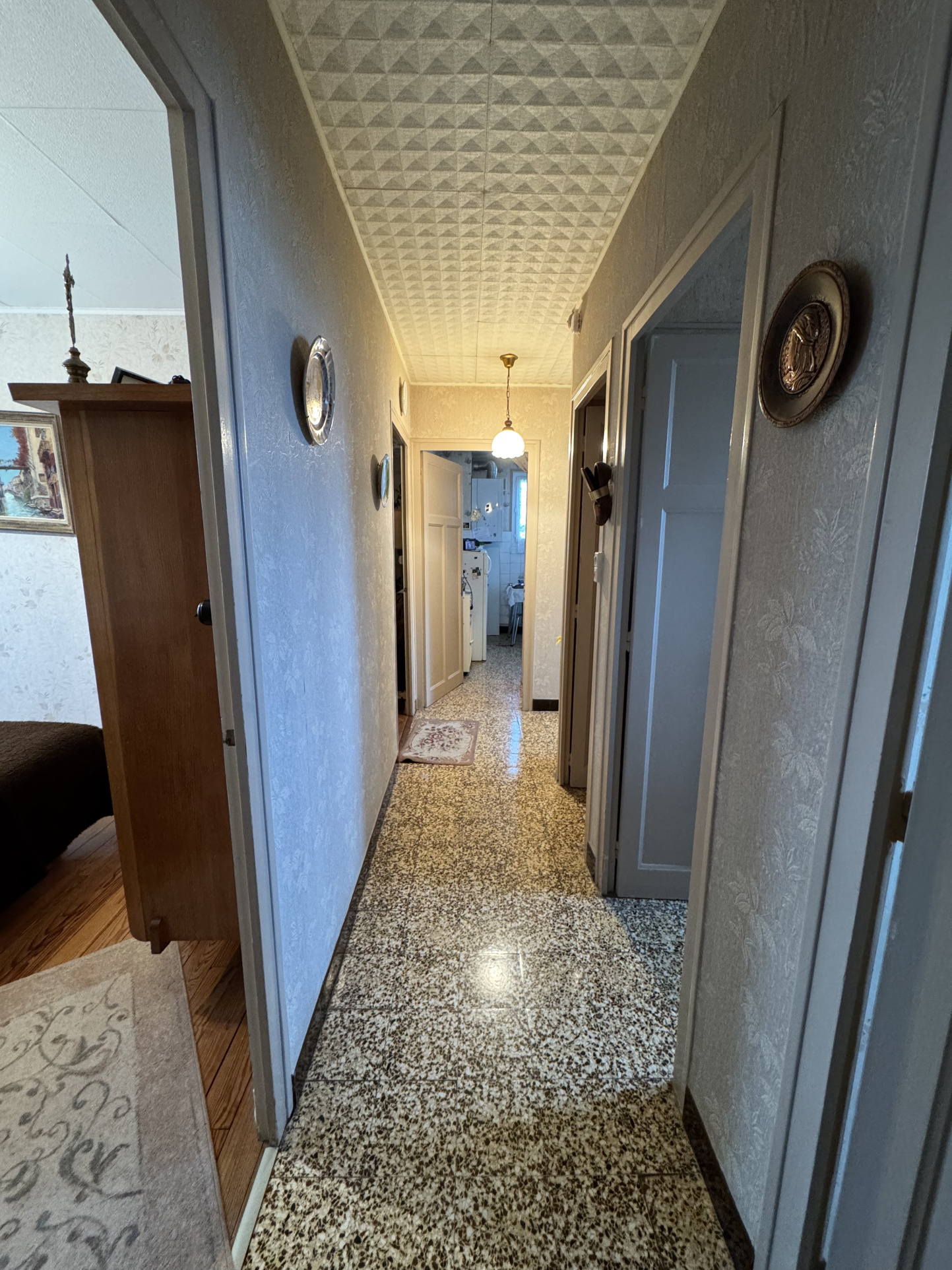 Maison d'habitation mitoyenne surélevée comprenant couloir desservant un séjour, cuisine, WC, salle d'eau, 2 chambres avec placard et 1 pièce à usage de chambre ou bureau.