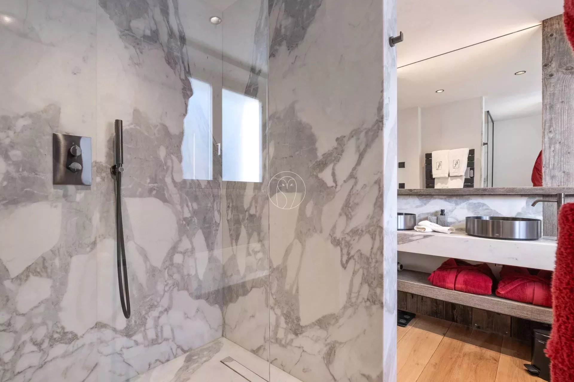 Au rez-de-jardin, vous découvrirez un espace bien-être complet comprenant une piscine intérieure, un hammam, une salle de sport ainsi qu’un ski-room.