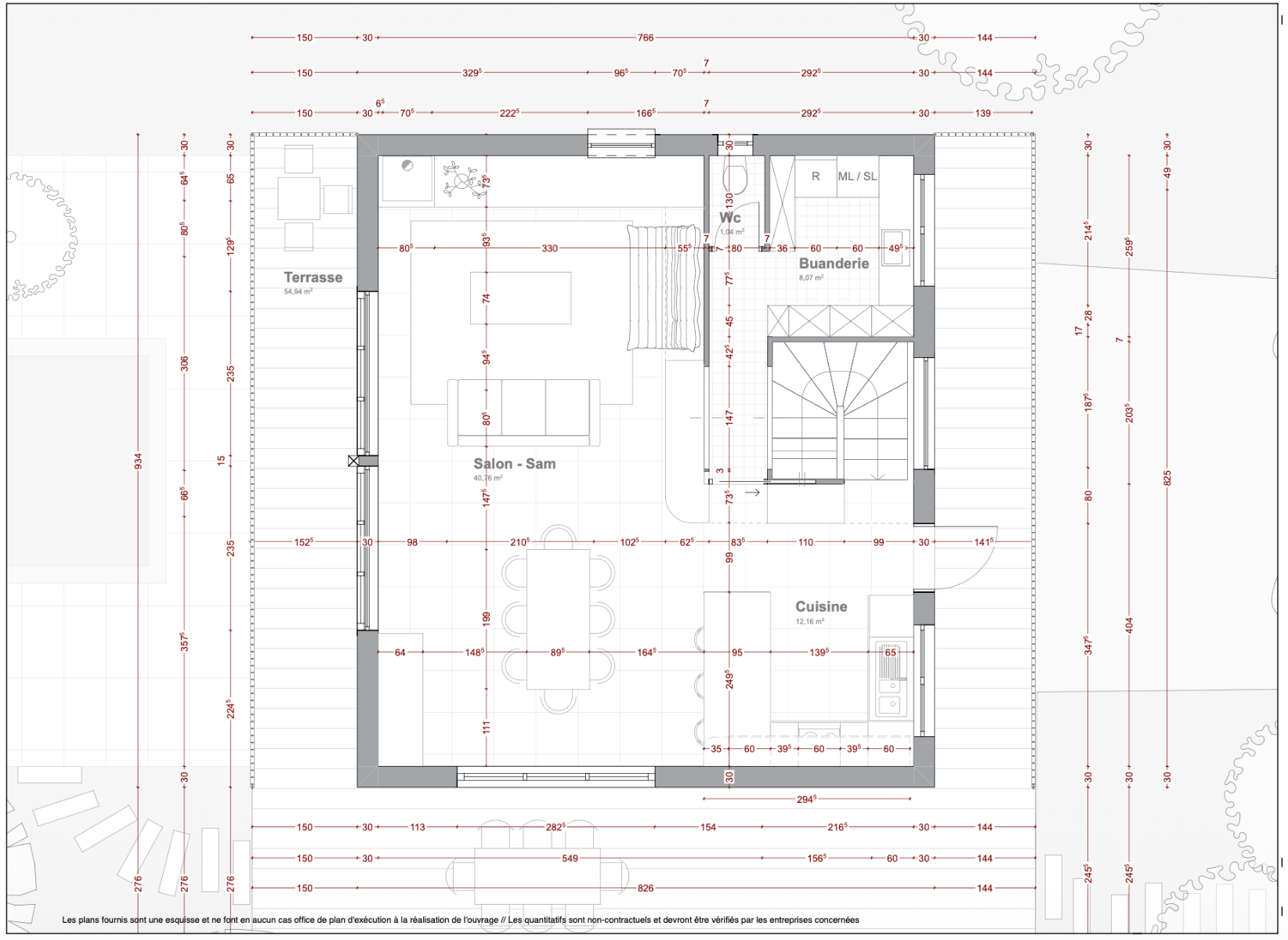 Le projet prévoit, à l'étage, un niveau de vie composé d'une pièce principale salon / salle à manger ouverte sur la terrasse, d'une cuisine avec îlot central, d'une buanderie ainsi que de sanitaires indépendants.
