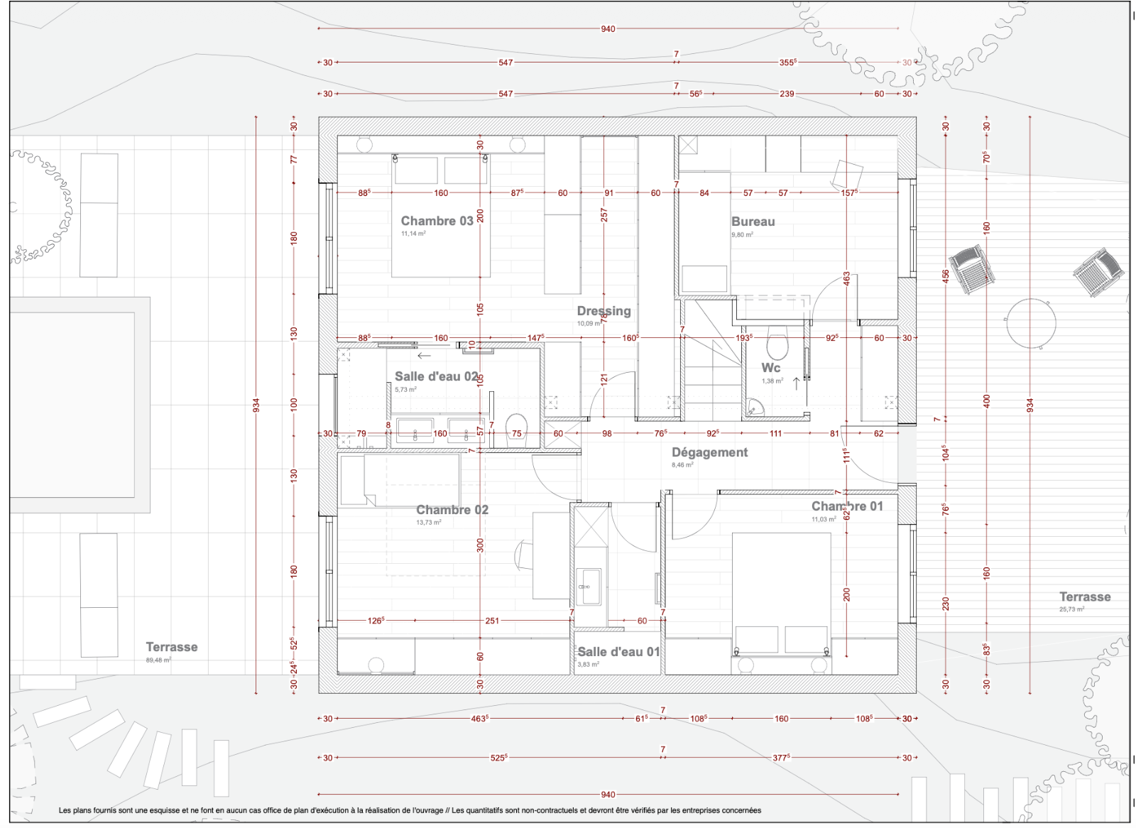 En rez-de-jardin, le projet propose un espace nuit composé de quatre chambres, chacune disposant de sa salle d'eau, offrant une vraie autonomie intérieure et un confort adapté à une vie familiale ou à l'accueil.