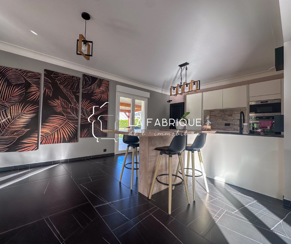 La pièce de vie, séduit par ses espaces ouverts, sa circulation fluide et son ambiance élégante. La cuisine, contemporaine et parfaitement intégrée, s'organise autour d'un îlot convivial, pensé pour les moments de partage du quotidien comme pour recevoir. Les matériaux, les luminaires et les tonalités choisies confèrent à l'ensemble un style soigné, actuel et intemporel.