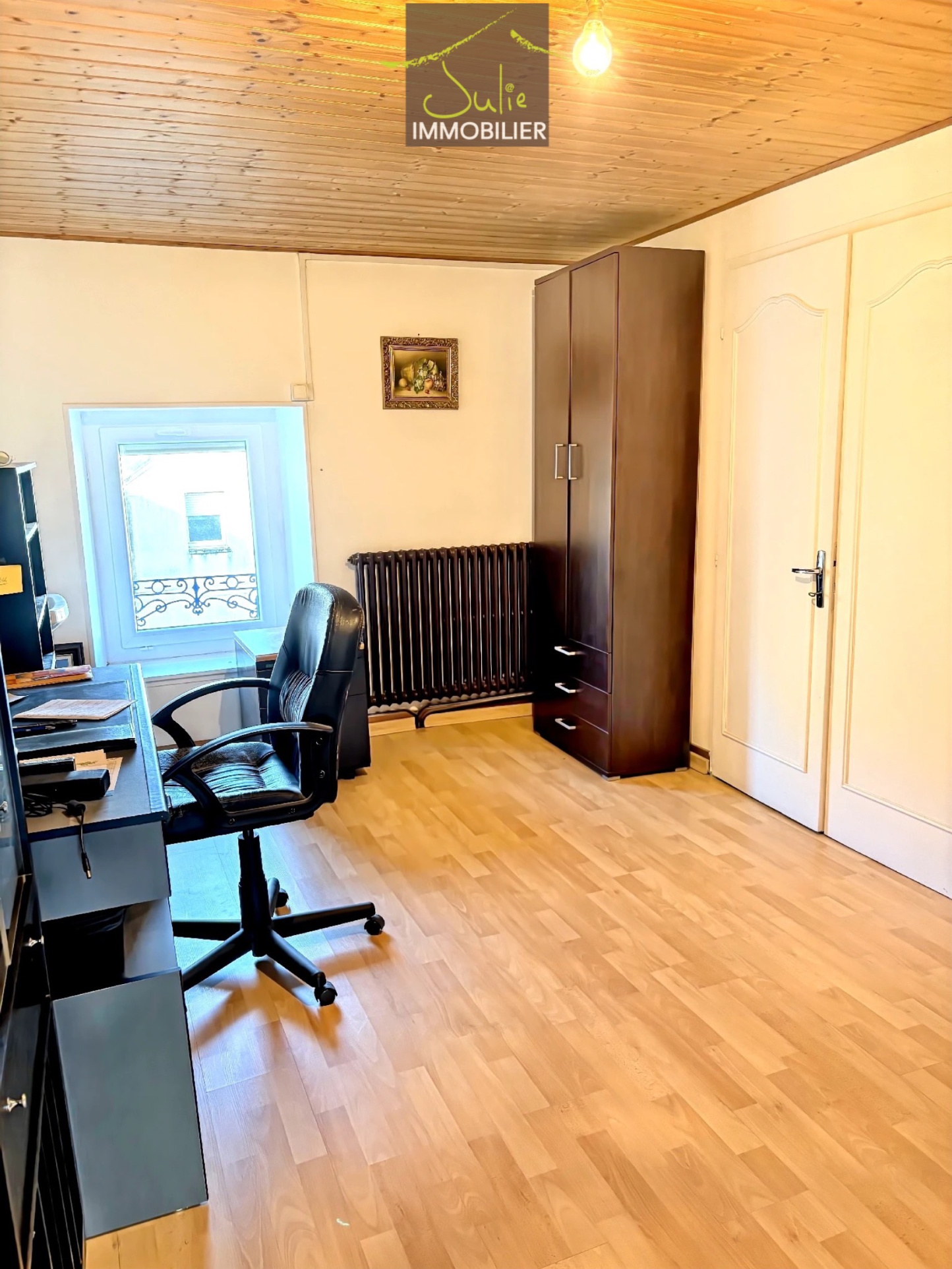 Idéalement située à proximité immédiate des commerces, cette maison de ville développe environ 140 m2 habitables. Elle se compose au rez-de-chaussée d'une entrée, d'un salon-séjour de 30 m2 avec cheminée, d'une cuisine indépendante de 14,5 m2, d'un coin salle d'eau, de WC séparés et d'une chaufferie. Les étages accueillent quatre chambres réparties sur deux niveaux. Le premier étage comprend deux chambres ainsi qu'une salle d'eau avec WC. Le second étage propose deux chambres supplémentaires et un grenier de 9 m2 offrant un espace de rangement ou un potentiel d'aménagement complémentaire. Une terrasse permet de bénéficier d'un espace extérieur. Un garage non attenant de 45 m2 complète le bien. La maison est équipée de menuiseries en double vitrage PVC et d'un chauffage au gaz de ville.