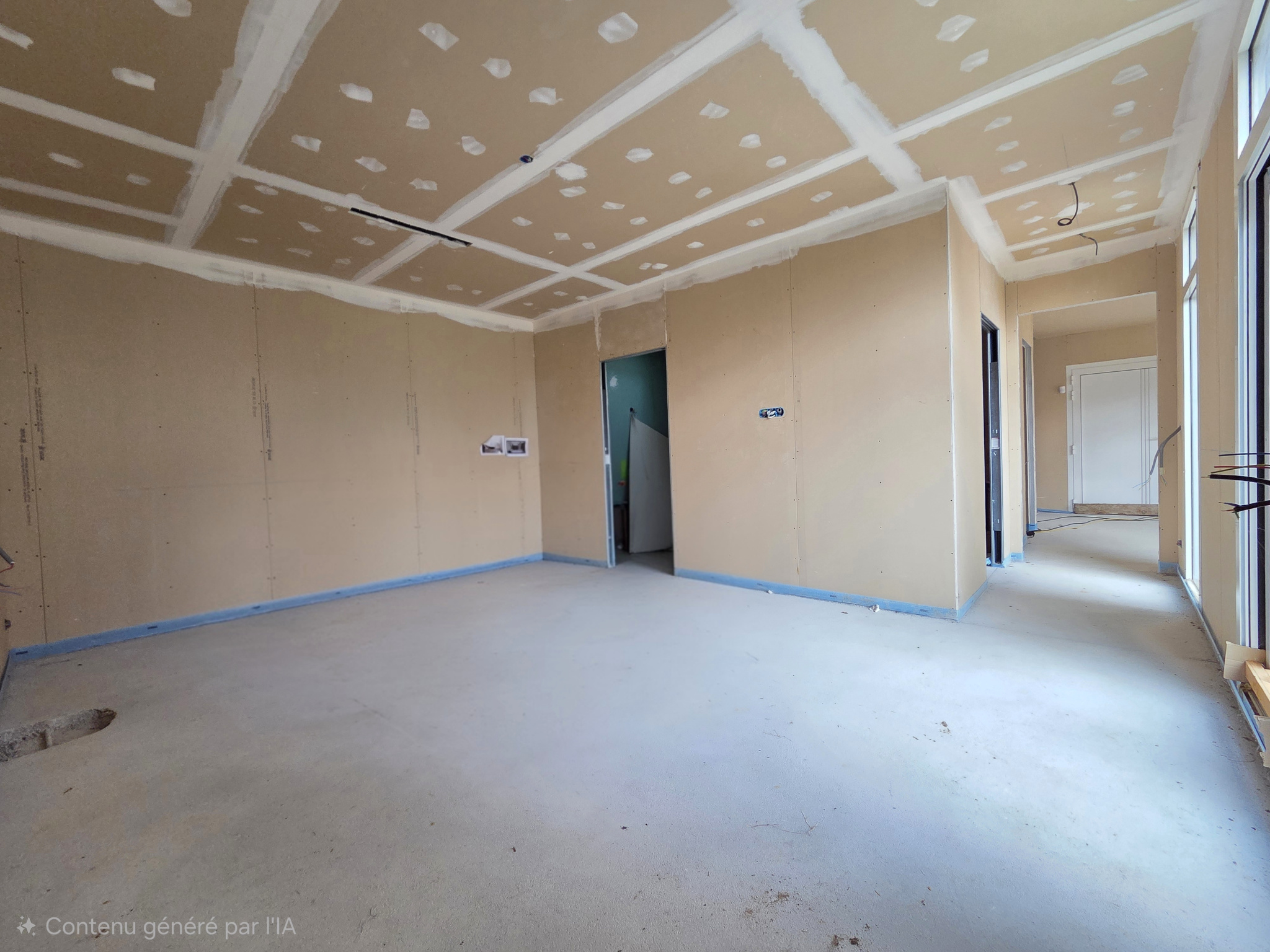 Un sous-sol partiel décomposé en 3 parties distinces avec espace cave à vin, une grande pièce et un espace pour rangements. La construction est hors d'eau hors d'air : fenêtres, toiture, électricité, plomberie et cloisons sont terminées, ainsi que le chauffage au sol et alarme.