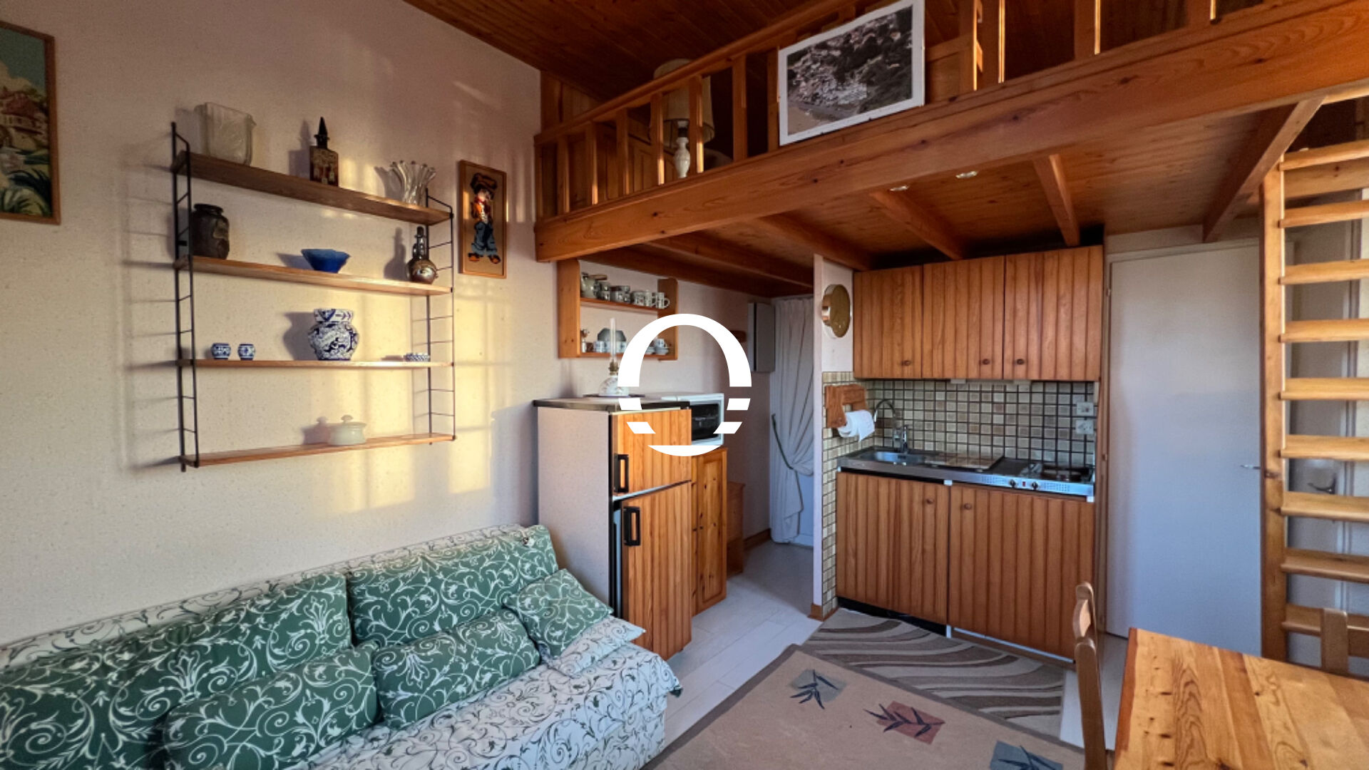 Une pièce de vie fonctionnelle avec kitchenette, une salle d'eau avec WC et une mezzanine optimisée pour un couchage d'appoint.