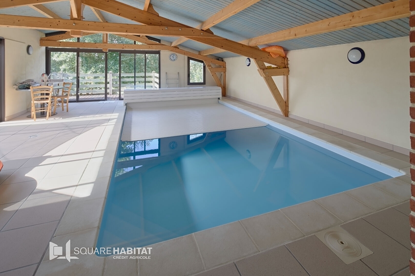 L'espace intérieur, aux volumes généreux, se compose d'un hall d'entrée spacieux, d'une cuisine aménagée et entièrement équipée, ouverte sur un salon-séjour chaleureux avec poêle à bois. Le rez-de-chaussée comprend également une chambre, une buanderie, un bureau, une salle d'eau, un WC séparé, ainsi qu'un local technique. Vous apprécierez les moments de détente sur la terrasse et la piscine couverte, parfaites pour profiter des beaux jours. Une cave, une pièce supplémentaire avec cheminée, et un garage avec portail électrique viennent compléter cet ensemble.