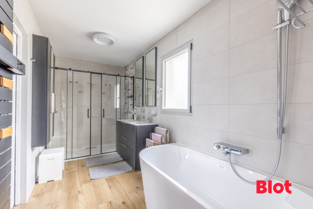 Une salle de bains haut de gamme avec baignoire et double douche, double vasque et des WC séparés.