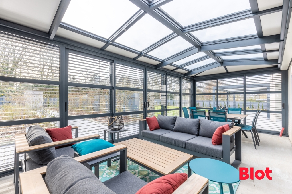 Dépendance avec même qualité de construction sur 2 étages permettant d'imaginer un aménagement supplémentaire (appartement indépendant, piscine intérieure et solarium, ...) donnant sur une véranda tout en verre sécurit, y compris le toit, avec équipements occultants électriques, chauffée par clim.