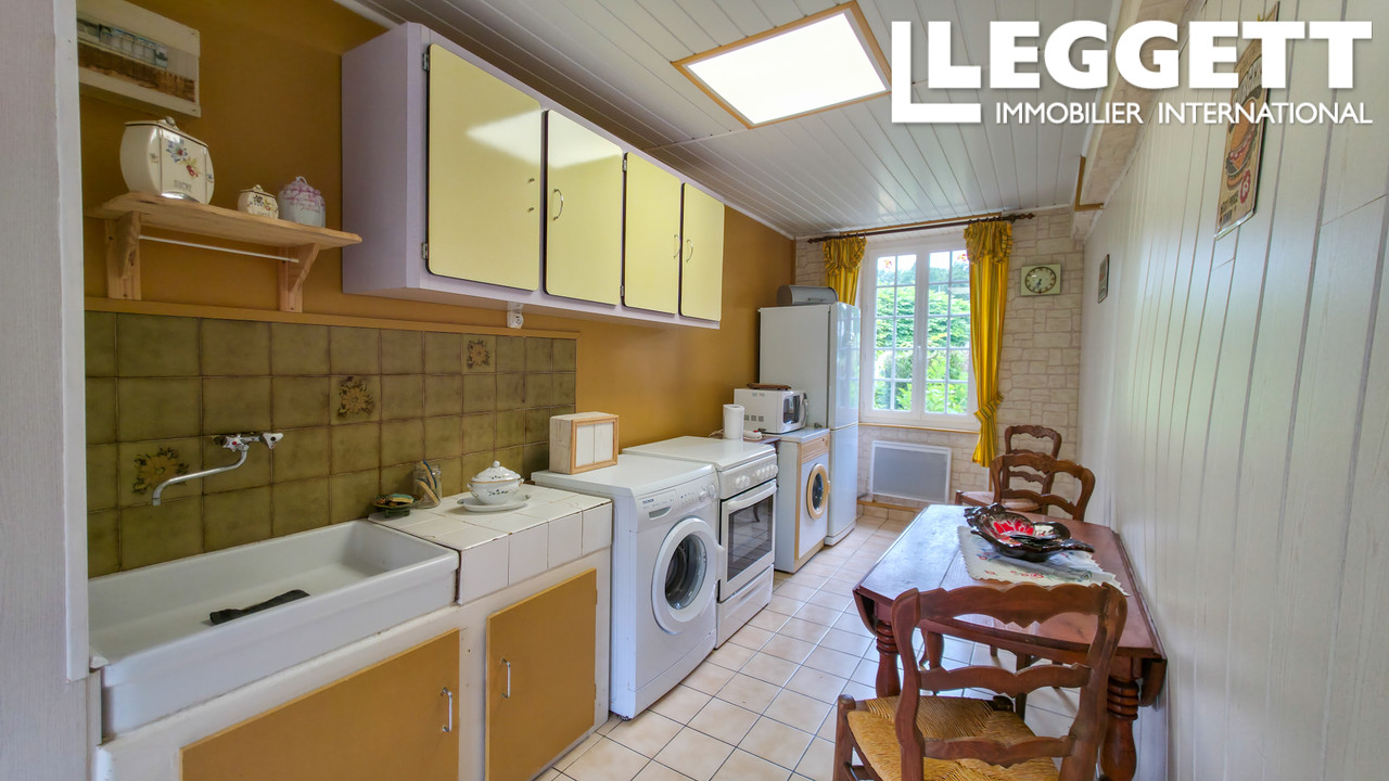Une petite maison en pierre avec un hall d'entrée donnant sur une cuisine bien agencée et un charmant salon avec coin repas.