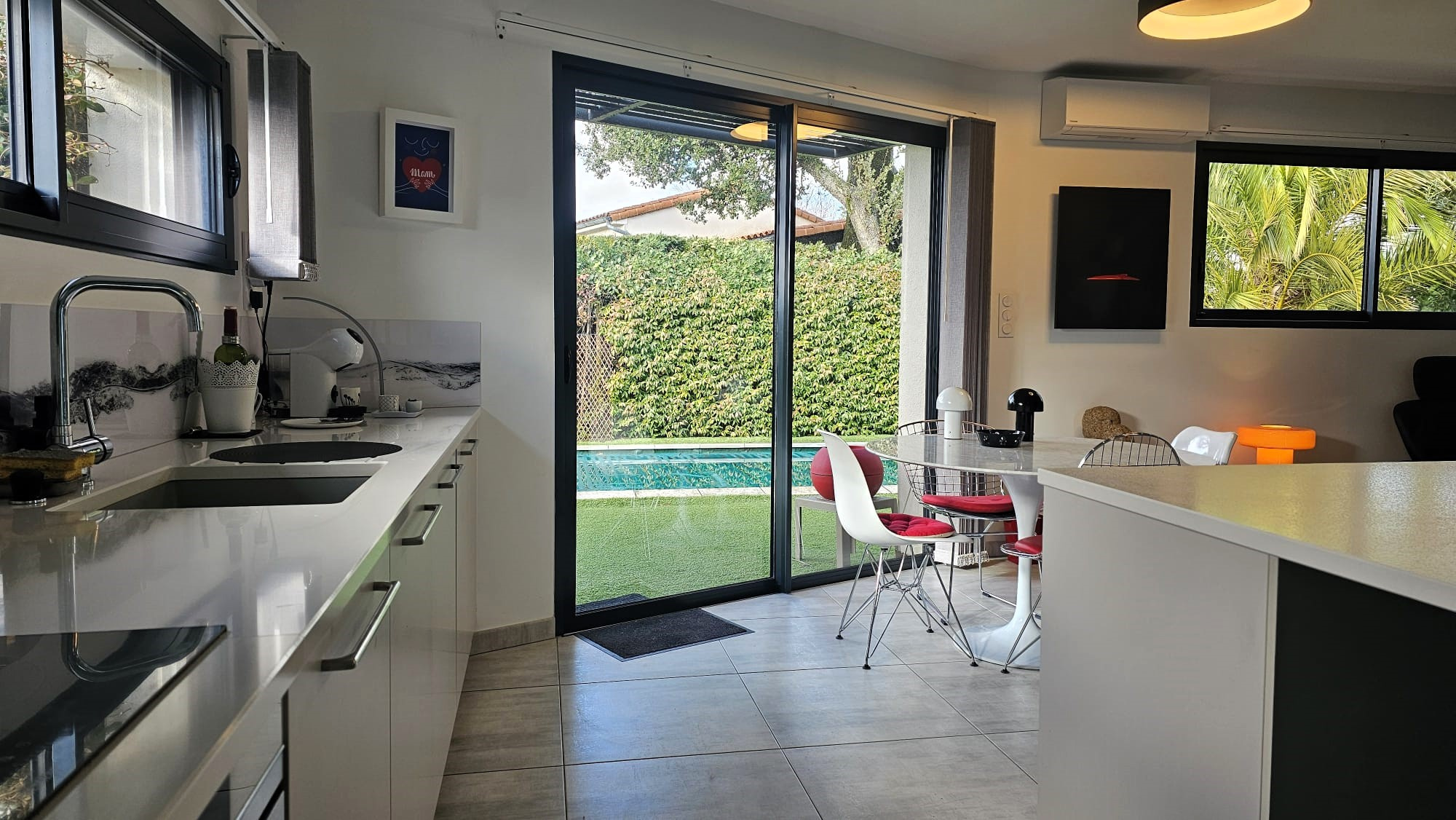 A l'étage : palier ouvrant sur balcon (possibilité de coin-bureau), chambre avec placard et salle de bains attenante avec douche à l'italienne, wc suspendus avec lave-mains, dégagement avec placard, chambre ou bureau, séjour avec climatisation réversible ouvrant sur terrasse et jardin avec piscine chauffée DESJOYAUX de 9X3, cuisine à l'américaine équipée (plaque, hotte, four, lave-vaisselle de marque NÖLTE), cellier attenant avec accès extérieur. Chauffage par pompe à chaleur.