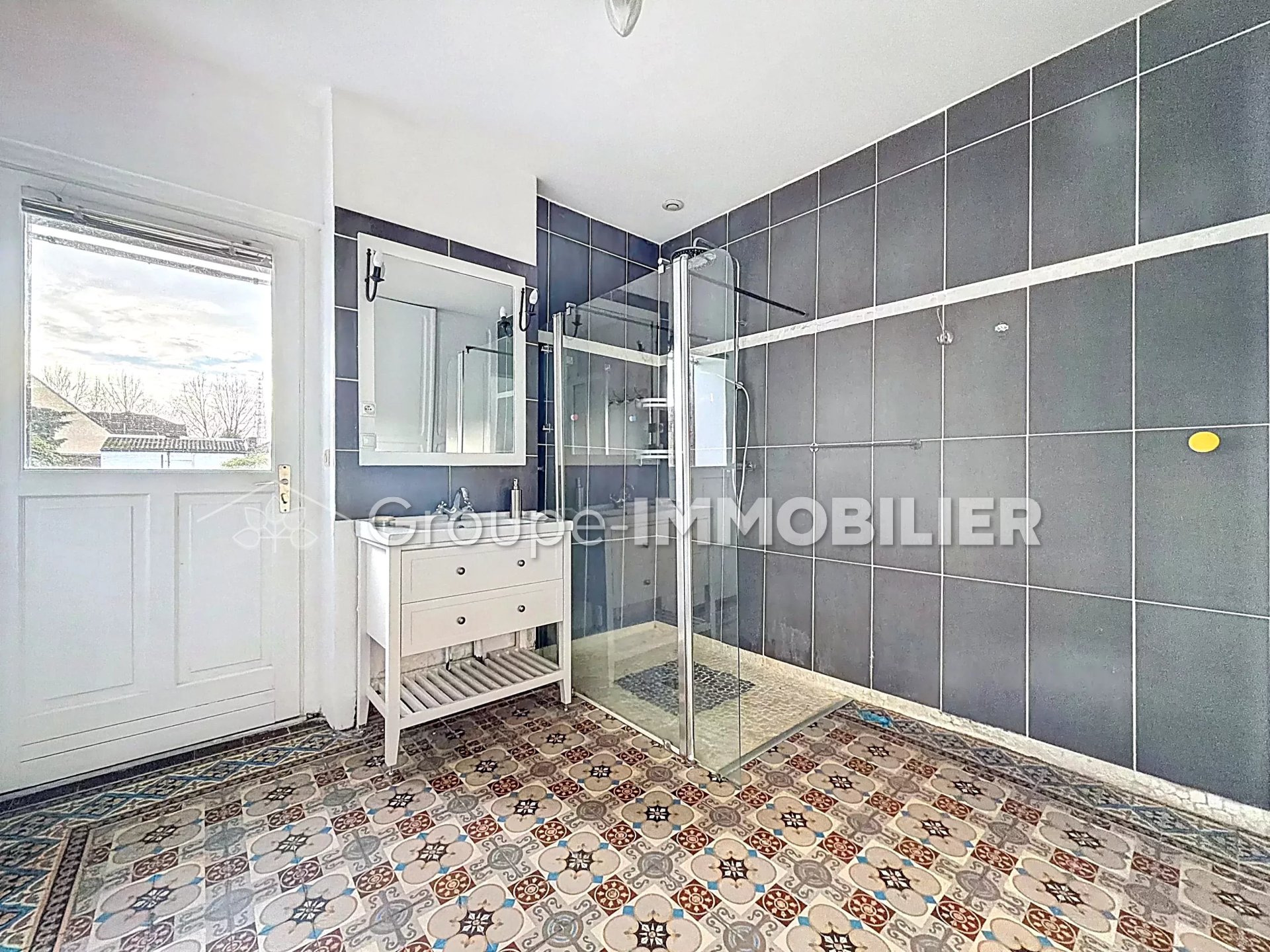 Le rez-de-chaussée offre également une chambre, une salle de bain ainsi qu’un WC, permettant une vie de plain-pied très appréciable.