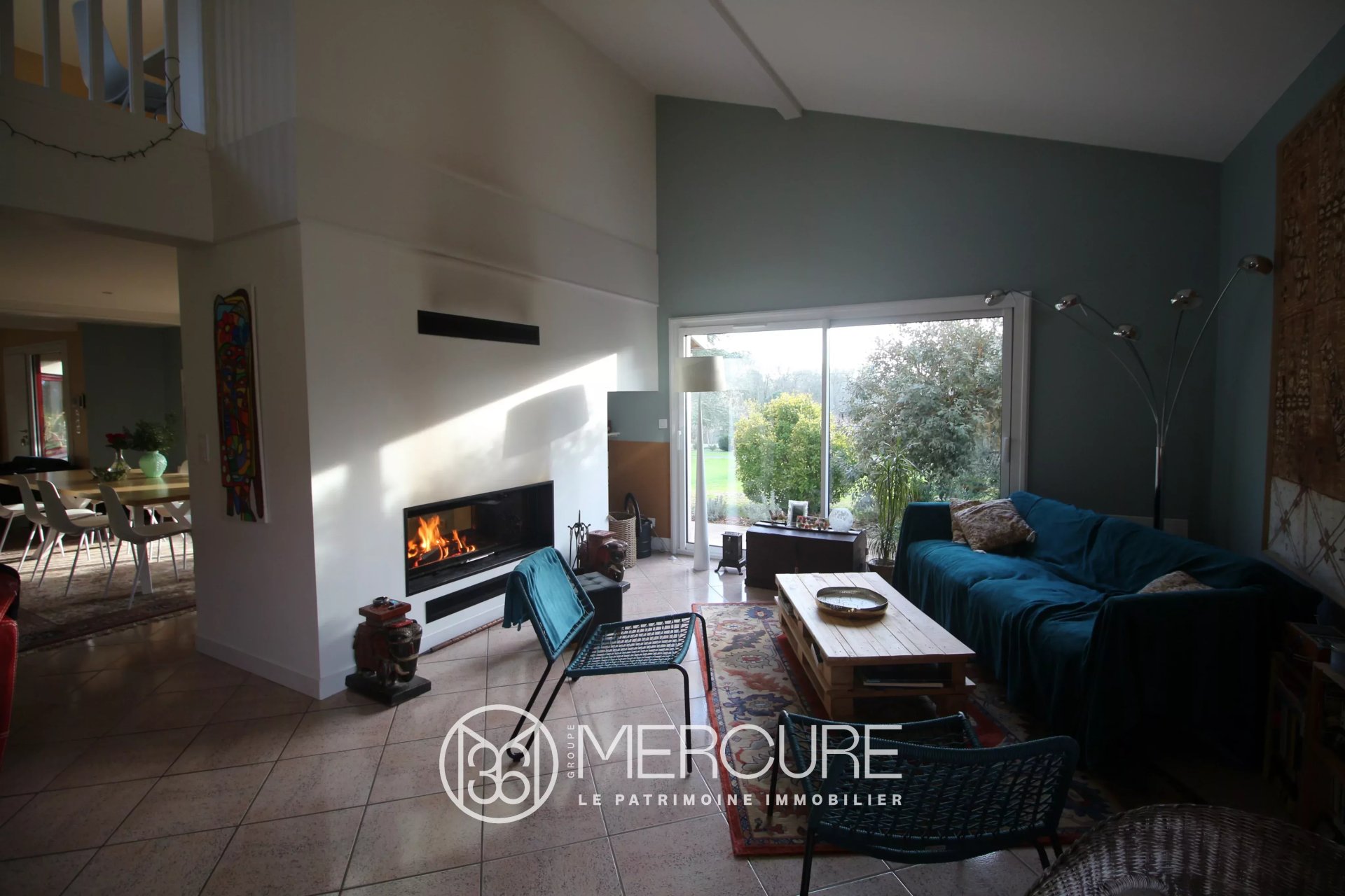 L’entrée s’ouvre d’un côté sur une grande pièce de vie avec espace salon et espace salle à manger où se trouve un insert double face, plafond cathédrale côté salon, accès à l’étage à une mezzanine surplombant le séjour et une chambre avec salle d'eau et toilettes.