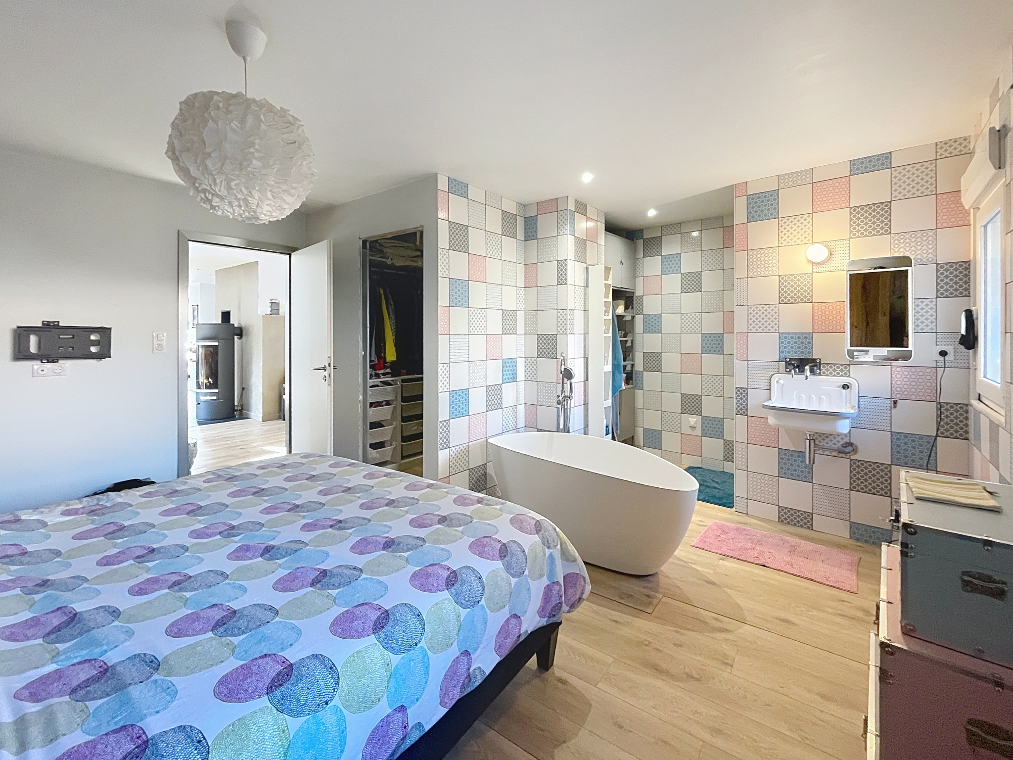 Elle offre au rez-de-chaussée une grande pièce de vie lumineuse avec poêle à bois, une cuisine équipée ouverte sur le jardin avec piscine hors sol et jacuzzi, ainsi qu'une suite parentale avec dressing et salle d'eau. Cellier, WC indépendants et garage complètent ce niveau.