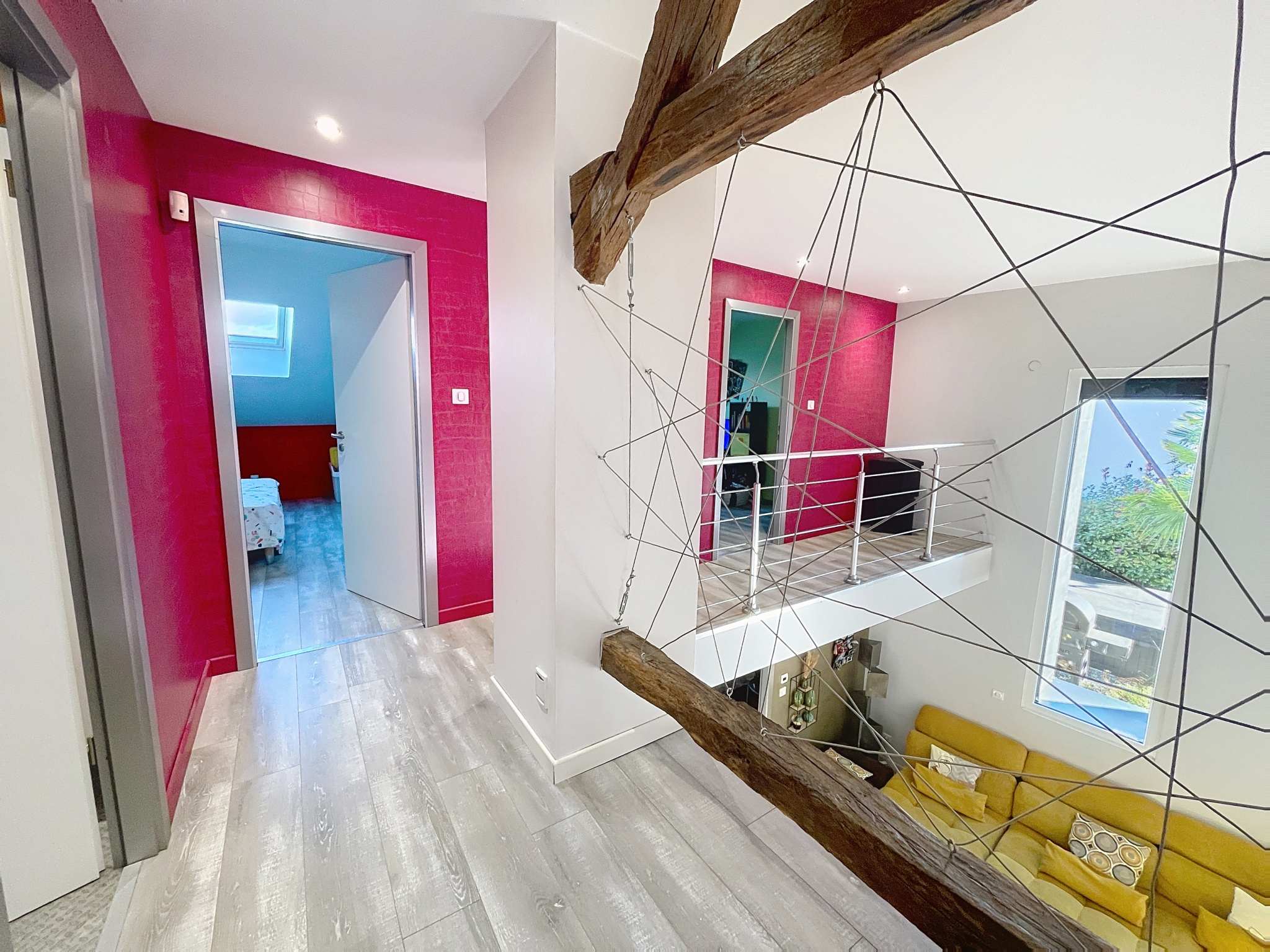 À l'étage, une mezzanine dessert trois chambres et une salle d'eau avec WC.