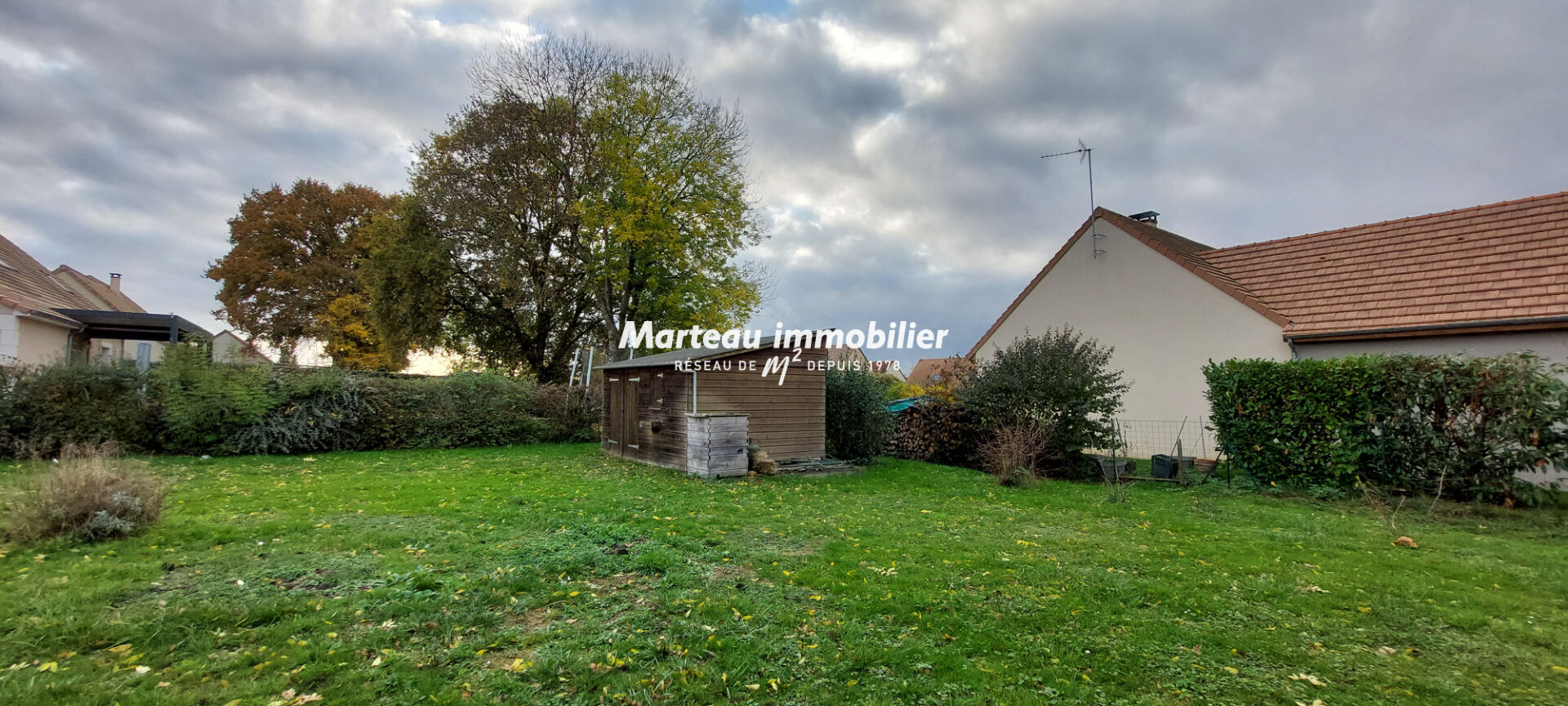 Terrain clos d'env. 1 160 m², abri de jardin, panneaux solaires sur toiture .
