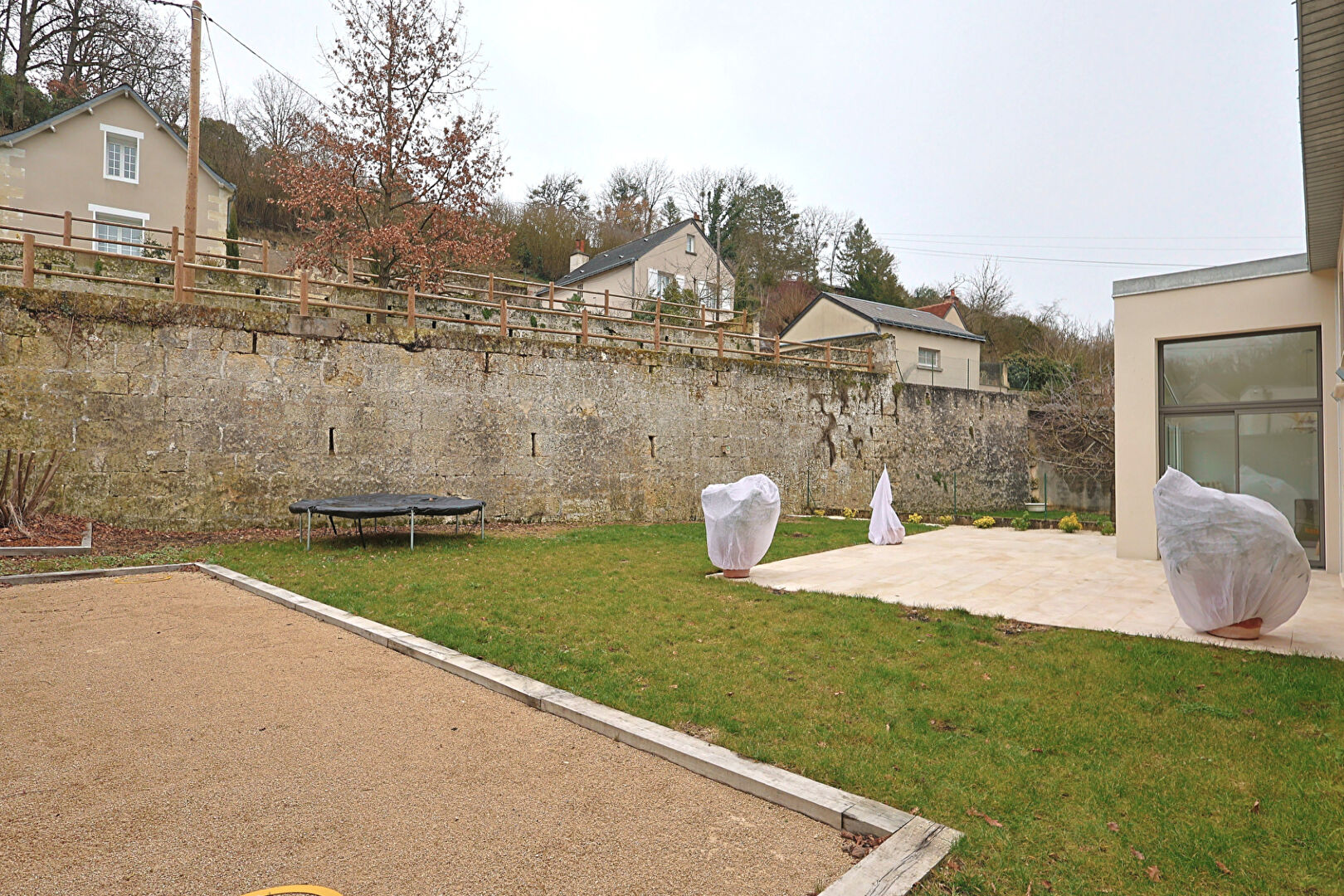 Côté extérieur, un terrain clos de 569 m², comprenant une terrasse en travertin de 50 m², un terrain de pétanque, un portail électrique, une porte de garage motorisée et la possibilité de stationner plusieurs véhicules.