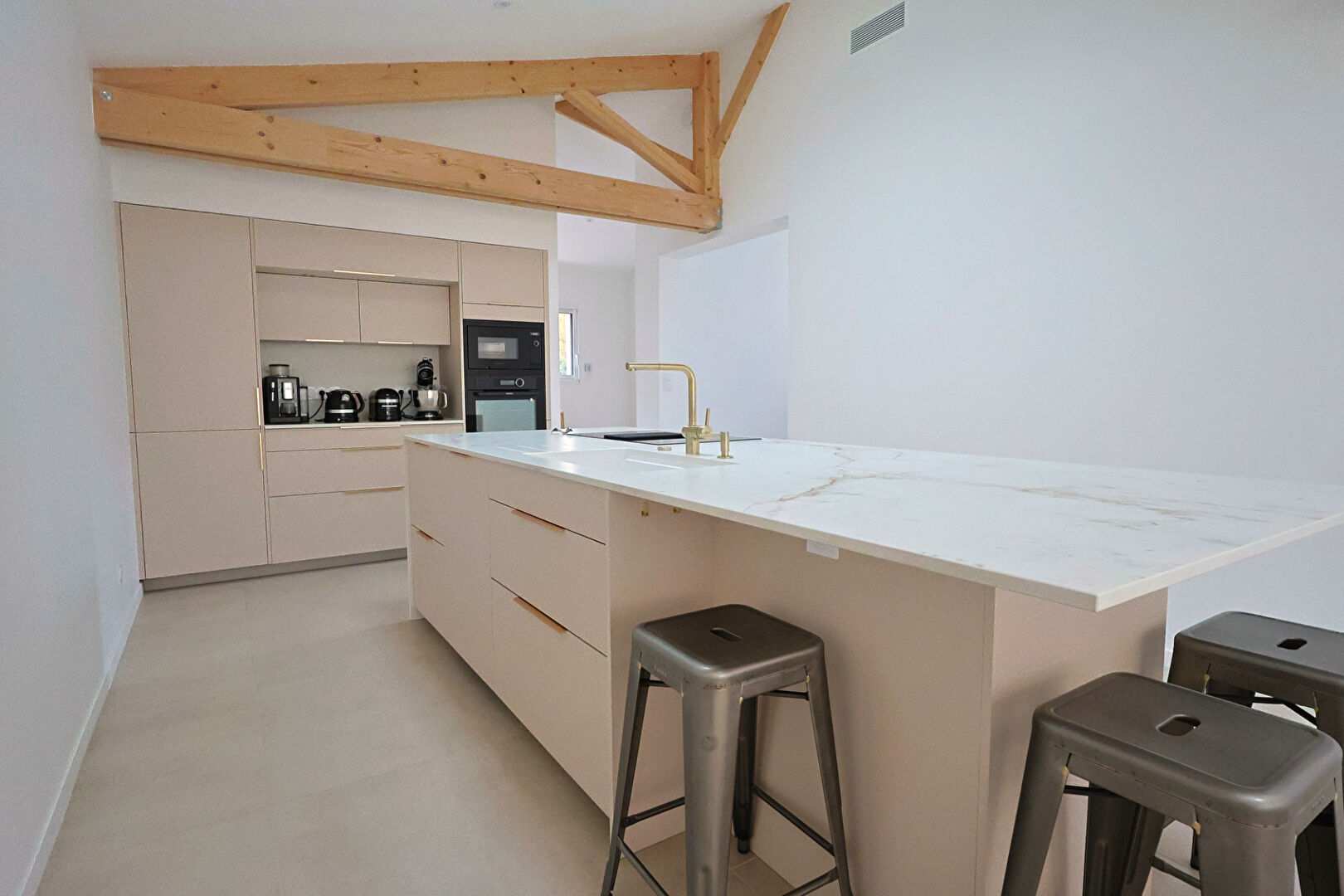 Au rez-de-chaussée, une grande entrée avec placard, un WC indépendant, un espace de vie généreux de 45 m², intégrant une cuisine ouverte haut de gamme, entièrement aménagée et équipée.