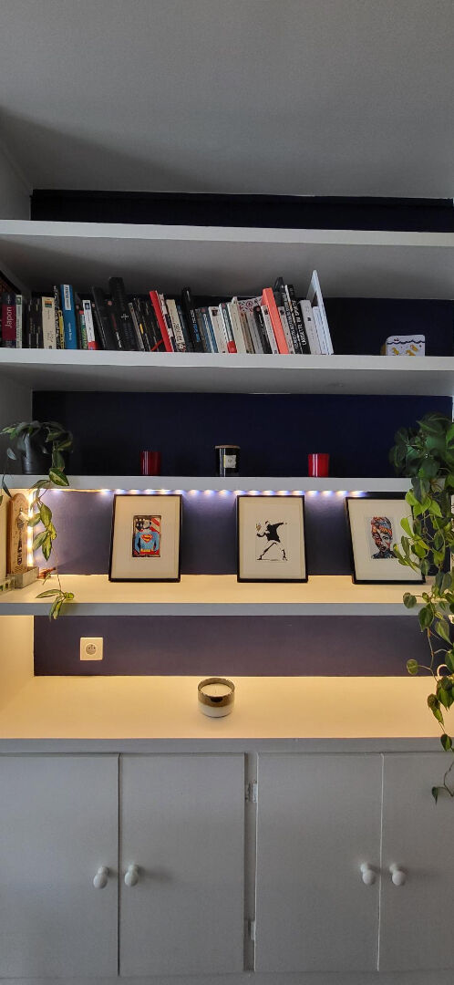 Entrée, WC séparé, grand séjour avec cuisine ouverte de 17.90m² baigné de soleil (exposition SUD-EST), cheminée d'agrément et disposant d'un mur aménagé sur mesure d'étagères et de rangements.