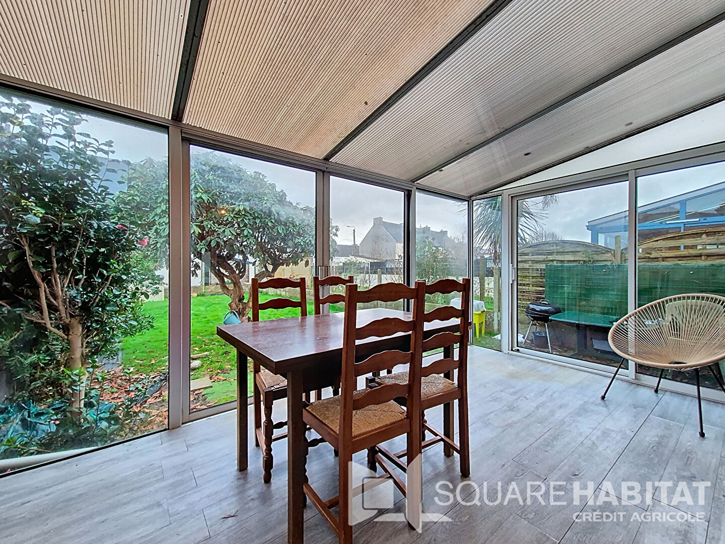 - Au rez-de-chaussée : entrée avec rangement sous escaliers, séjour donnant sur véranda et jardin, cuisine américaine équipée neuve, véranda donnant sur jardin.