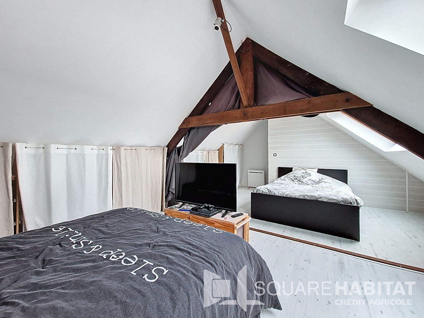 - Deuxième étage : une grande chambre de 25 m² au sol.