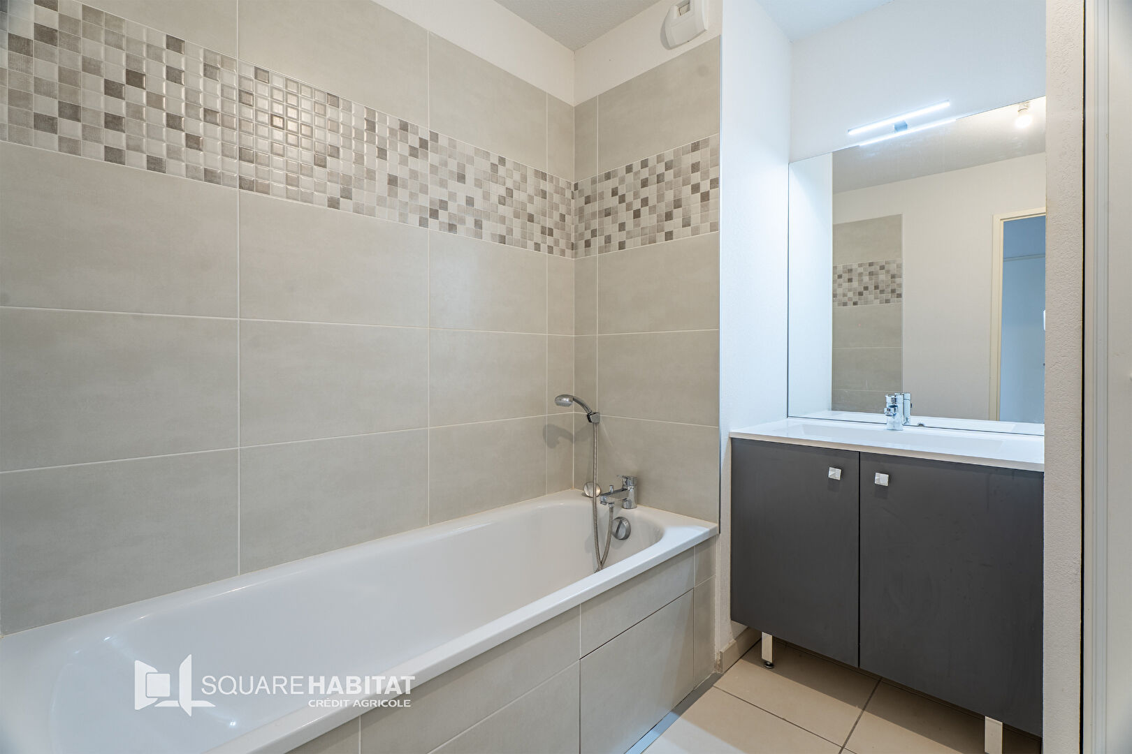 Il se compose d'un séjour, avec une cuisine ouverte équipée, donnant sur une belle terrasse de plus de 8m² exposée SUD, sans vis-à-vis. L'appartement est traversant.