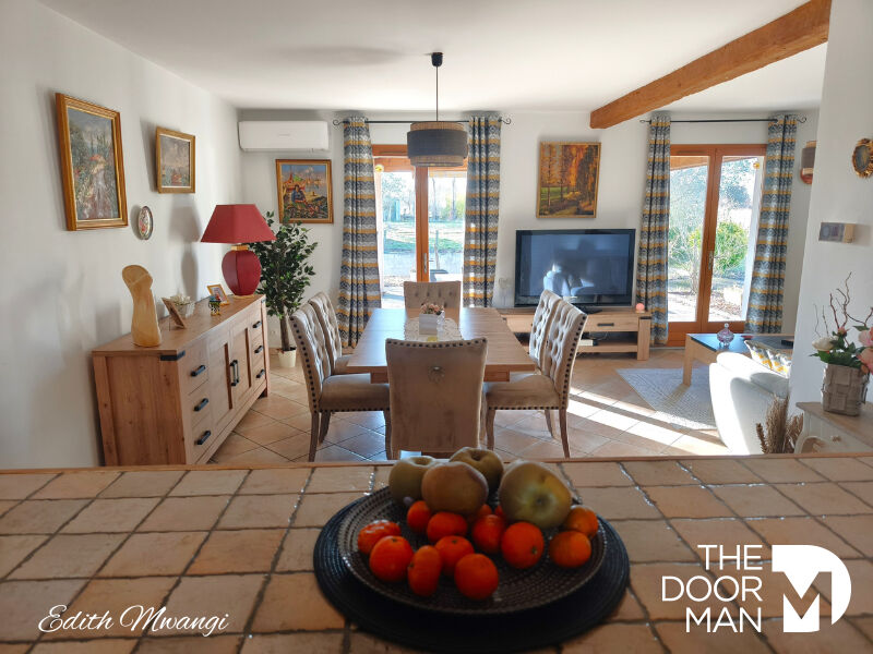 Espace jour : une grande entrée, une cuisine équipée semi-ouverte, une grande pièce de vie lumineuse équipée d'une PAC avec climatisation réversible, ainsi qu'un cellier.