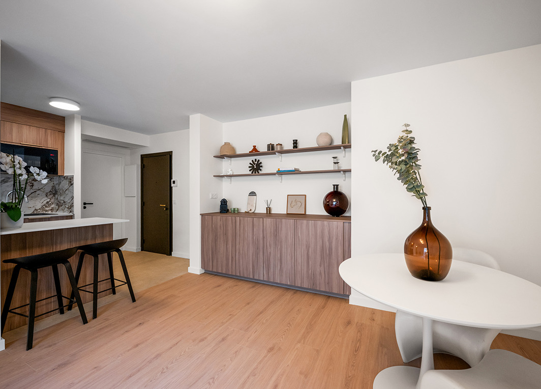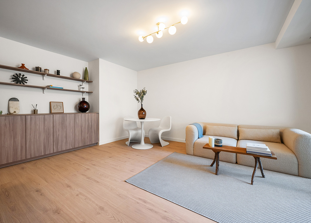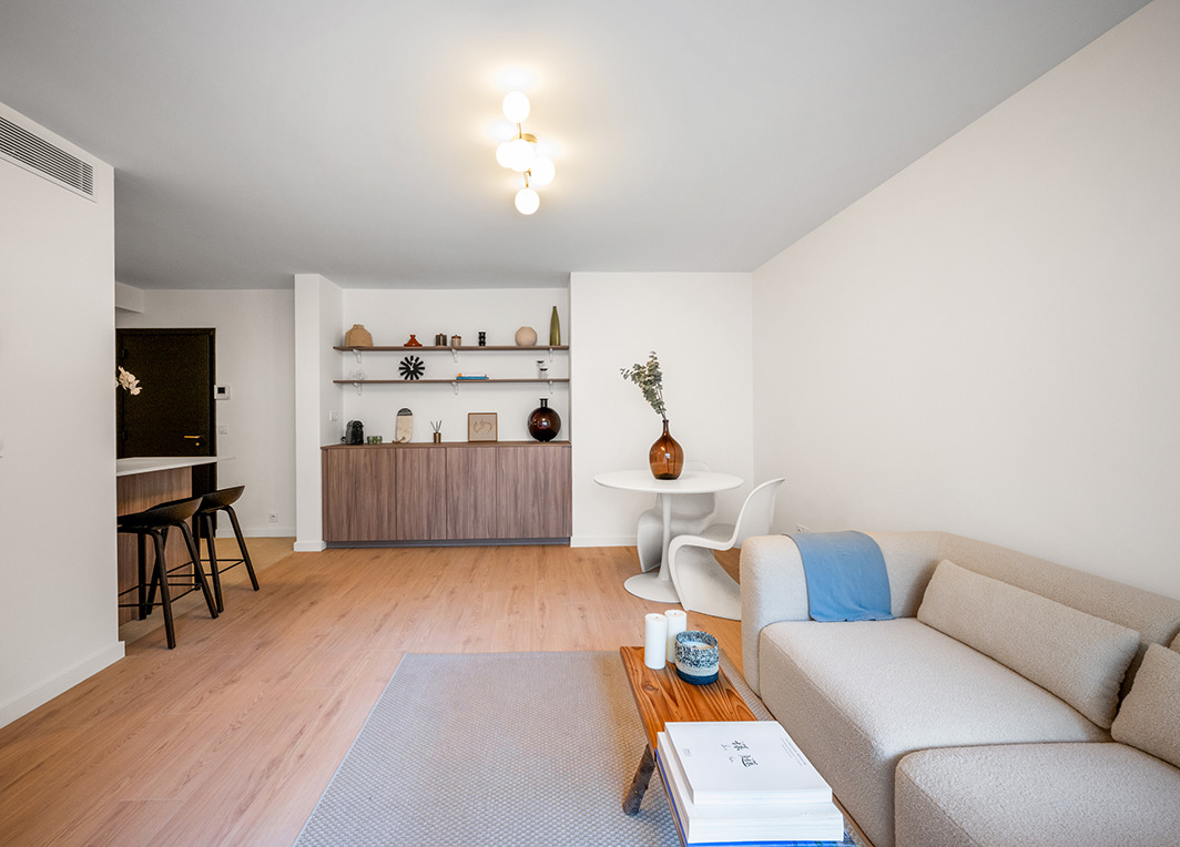 Une élégante cuisine ouverte/salon d'environ 27m² s'ouvre sur une petite terrasse de 4m². Une chambre confortable avec placards intégrés, une salle de douche attenante et un WC séparé.
