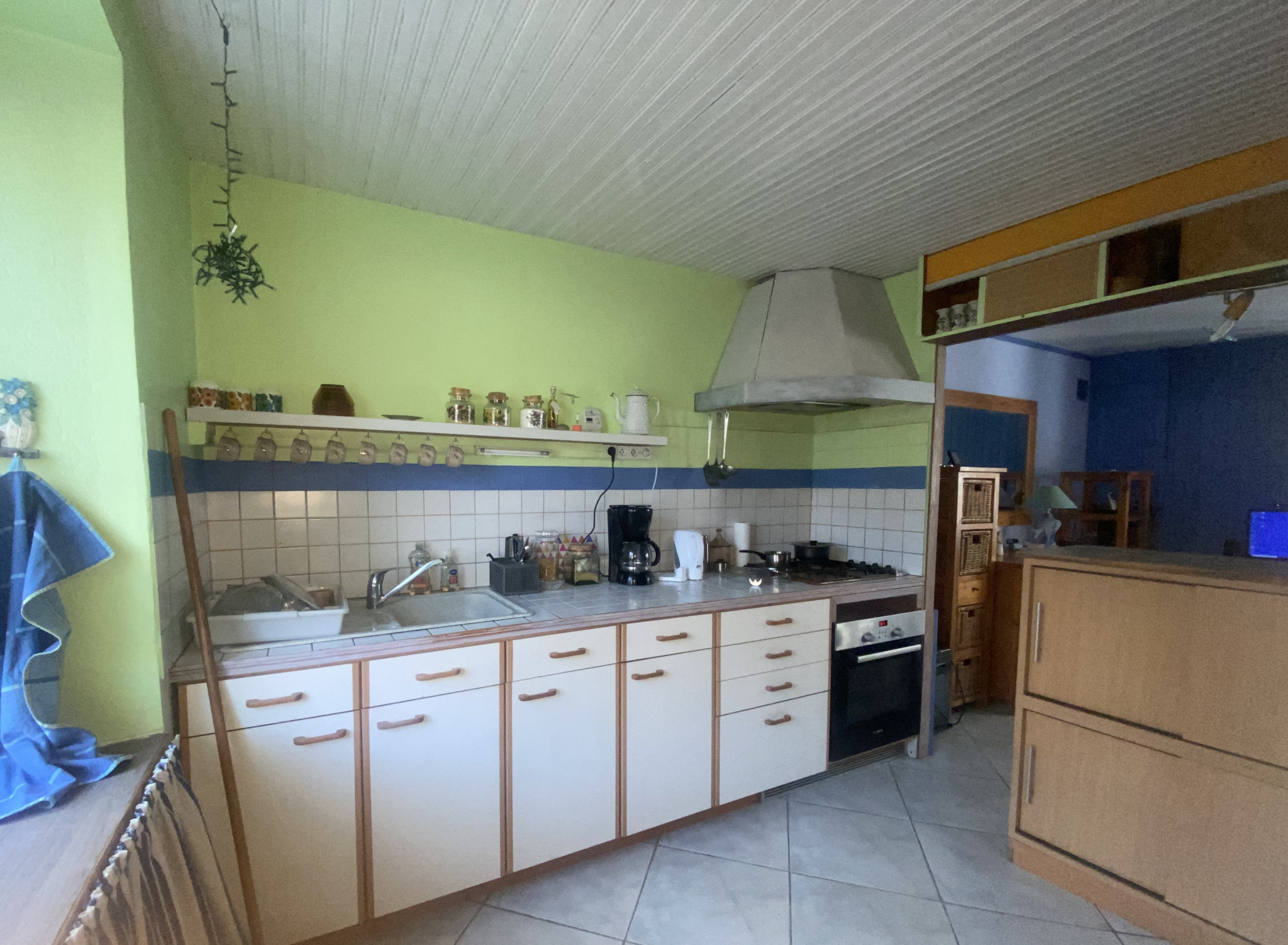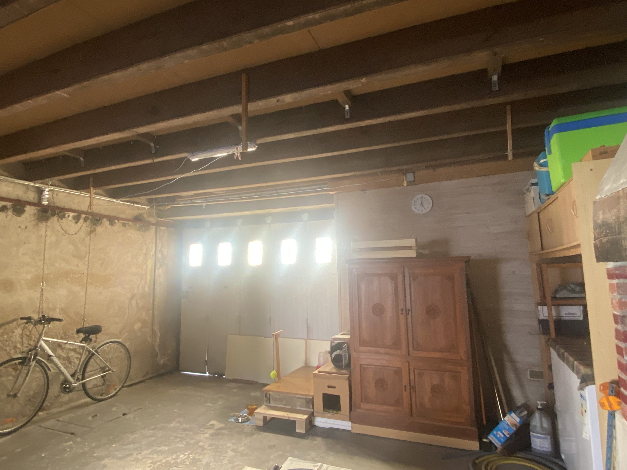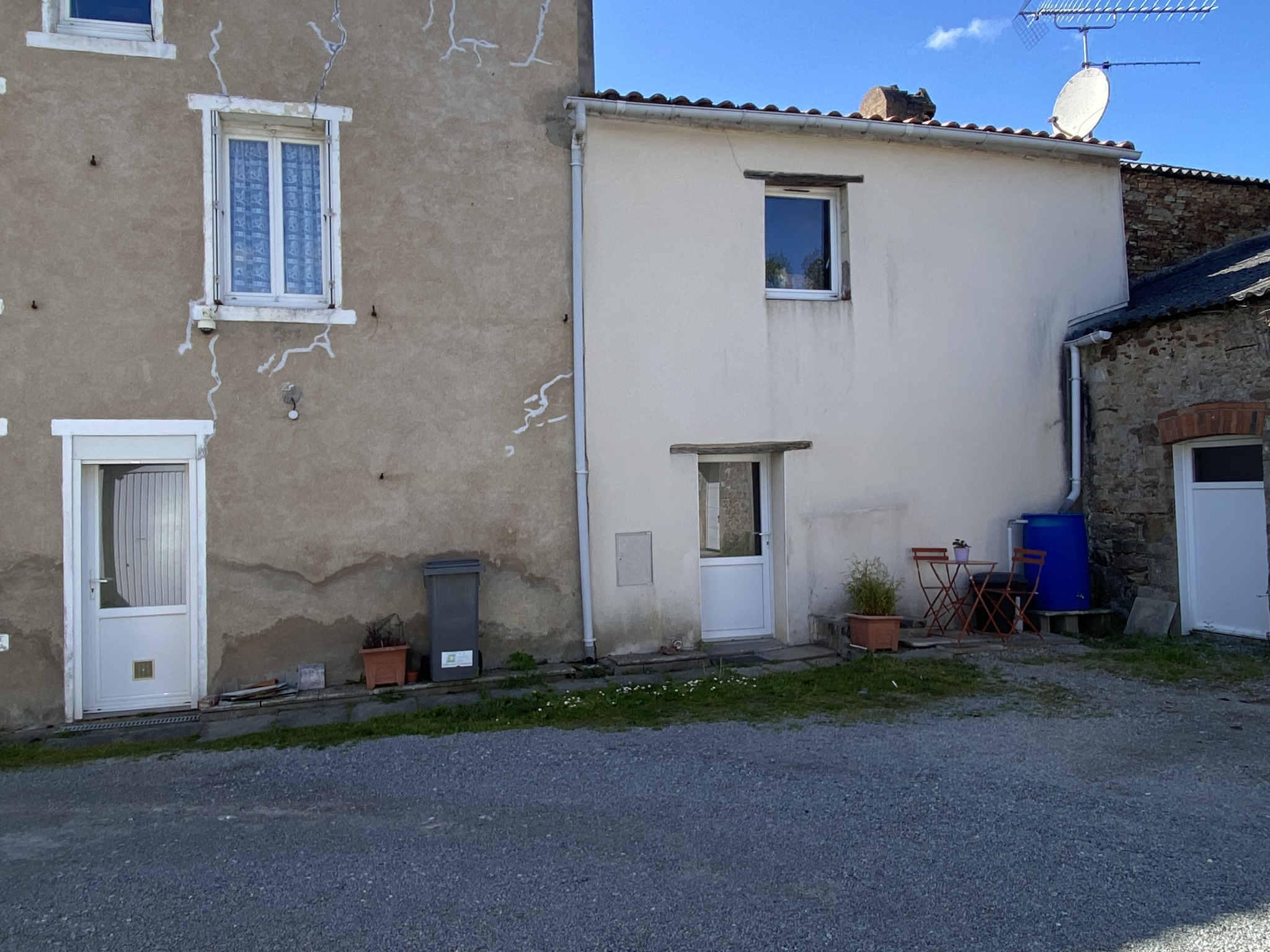 Un grand garage attenant (avec cheminée + grenier aménageable) pouvant servir d'arrière cuisine (point d'eau) avec une porte de service derrière donnant sur un petit espace extérieur aménagé (grevé de servitude de passage pour accès véhicules des autres habitations).