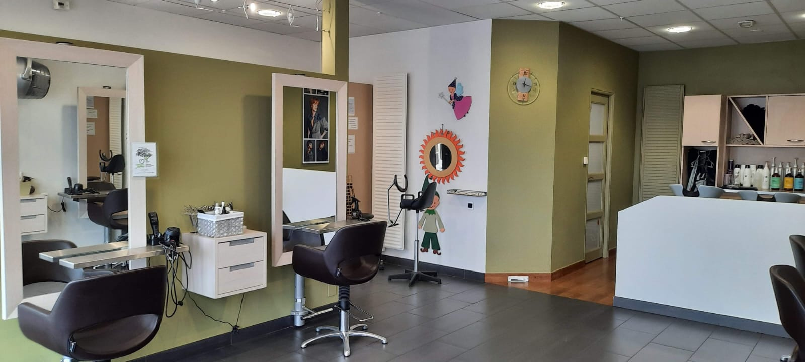 Local comprenant : espace d'accueil, vestiaire, 5 postes de coiffage, 3 bacs ergonomiques à shampooing (2021), réserve/salle de repos, WC.