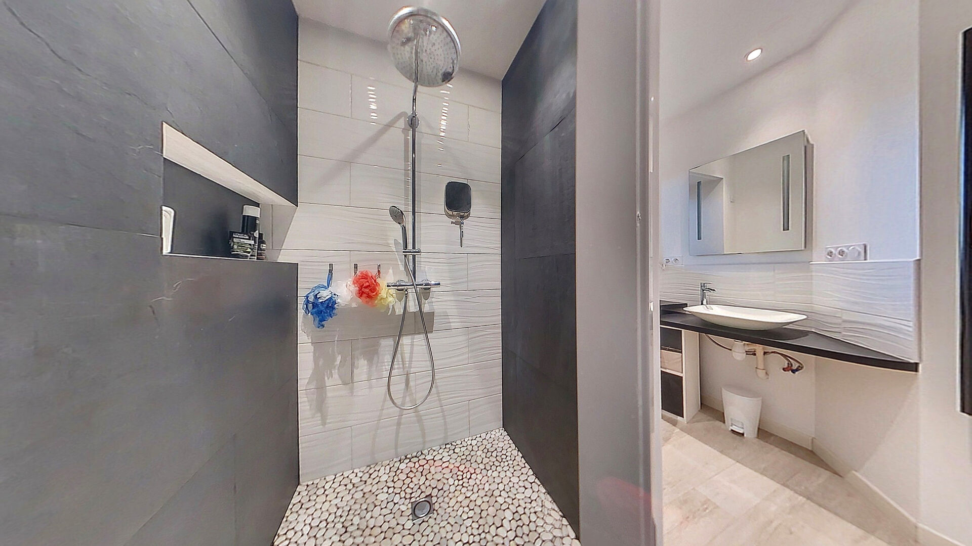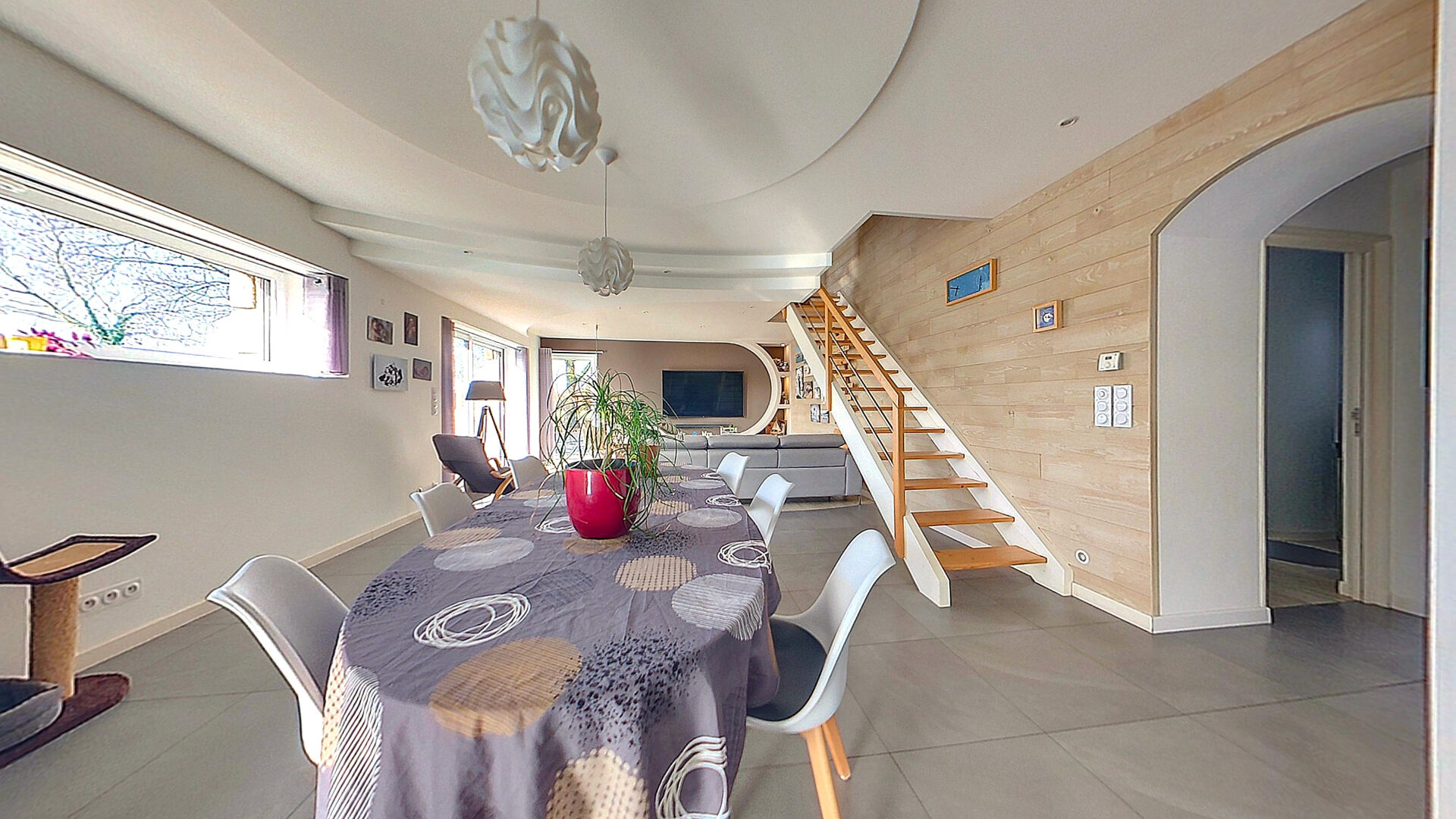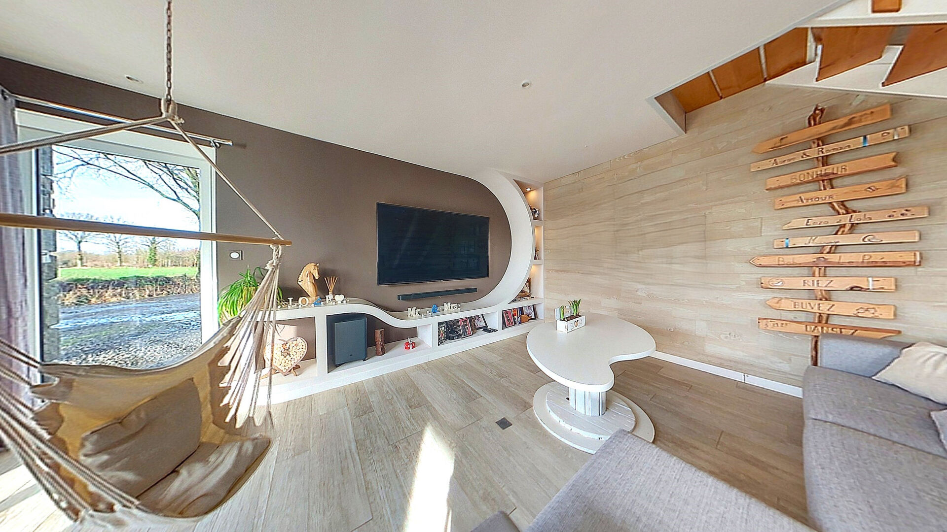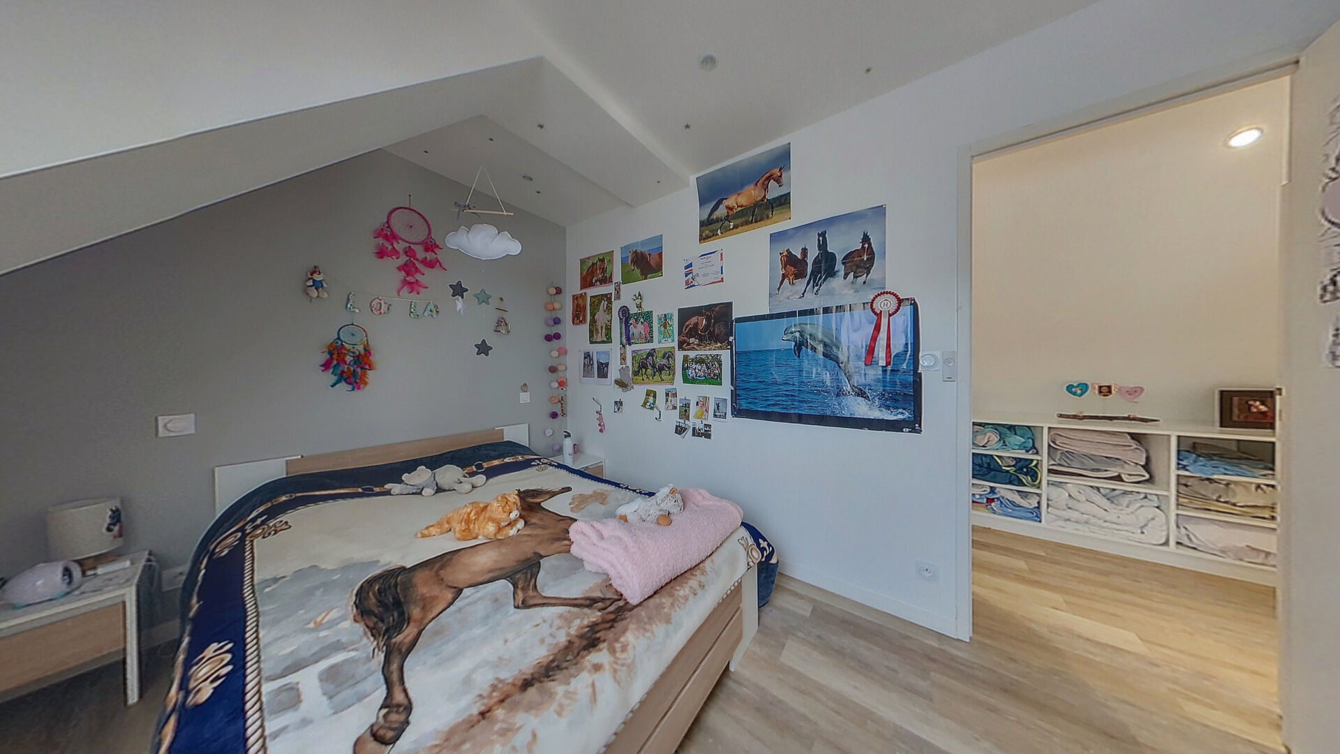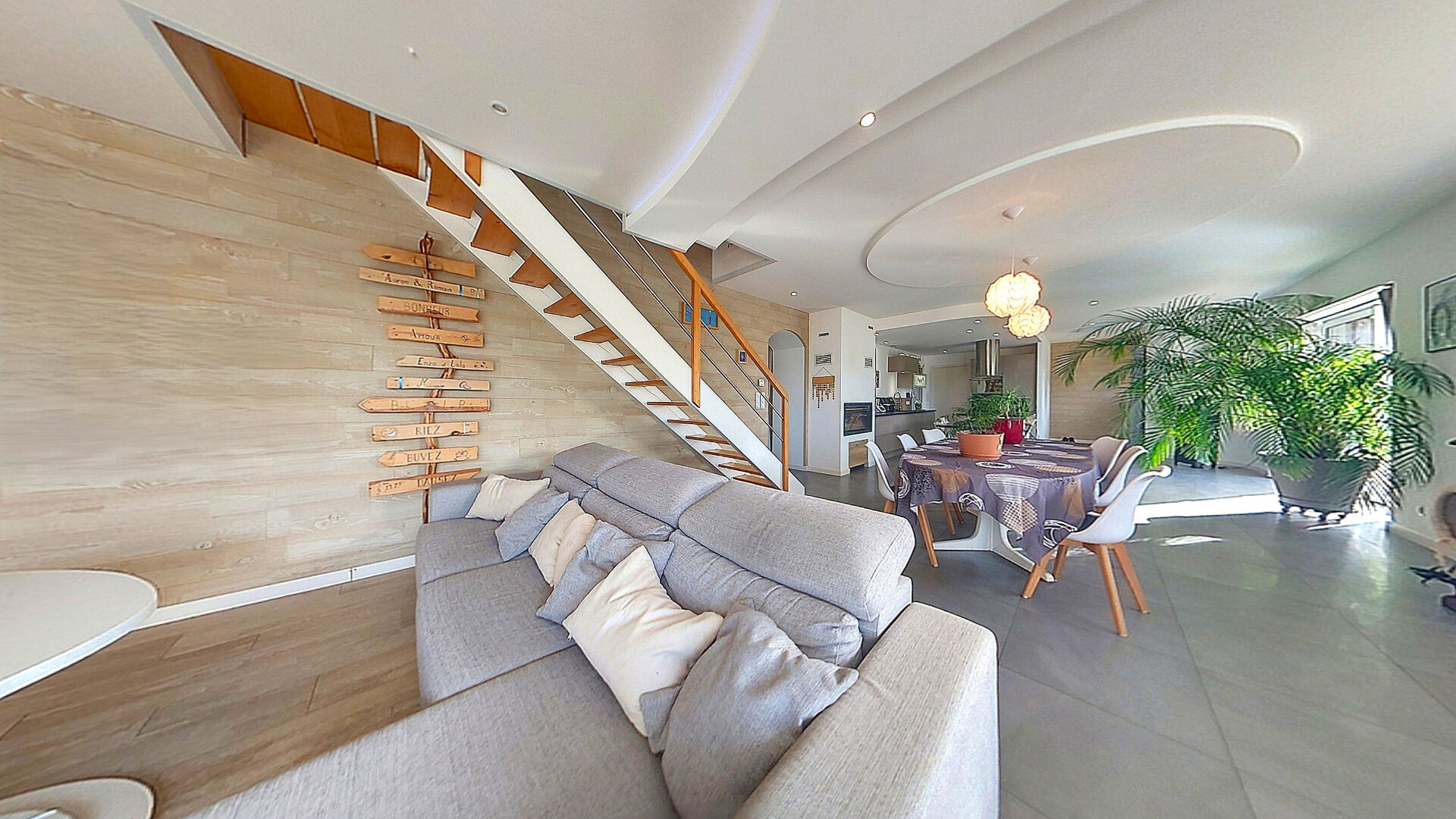 À l'étage, deux chambre, une salle de bains, un wc et une belle mezzanine baignée de lumière viennent enrichir les espaces de vie. Cette mezzanine offre une vue dégagée et apaisante sur le plan d'eau et se prête parfaitement à différents usages, qu'il s'agisse d'une salle de jeux, d'un espace billard, d'une pièce de musique ou d'un lieu de détente selon les envies.