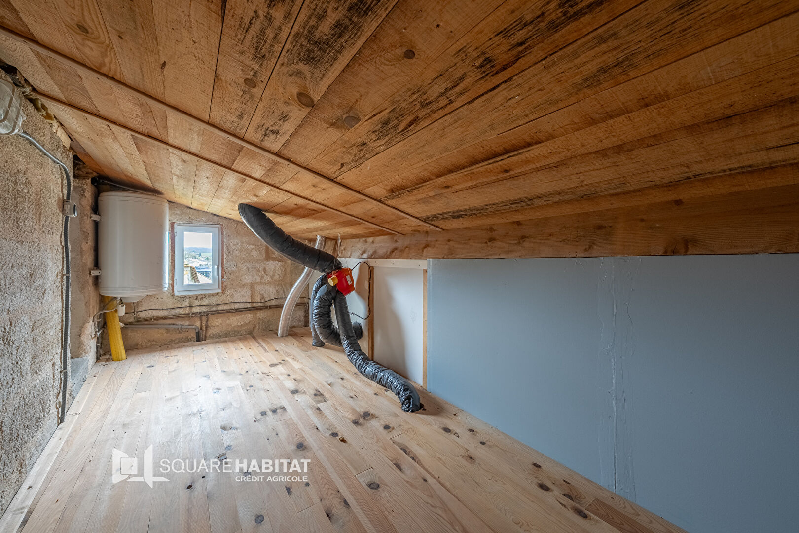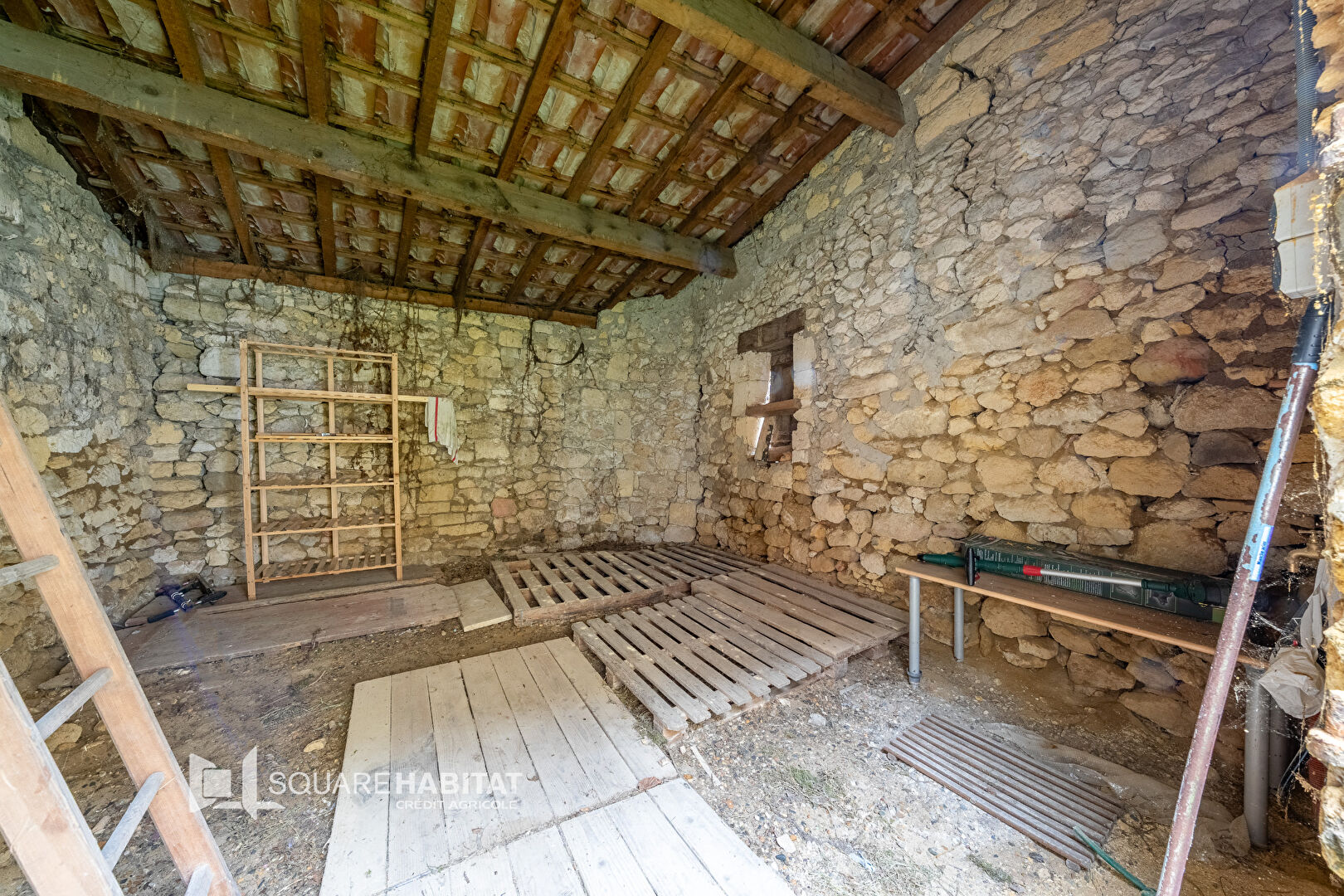 La maison ne dispose pas de terrain, hormis un petit espace devant la porte d'entrée, et bénéficie d'une grange de stockage.