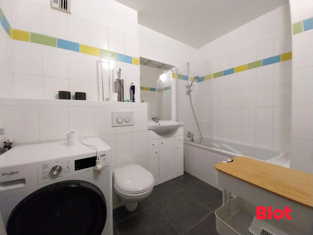 La salle de bain avec WC, spacieuse, permet l'installation d'une machine à laver.