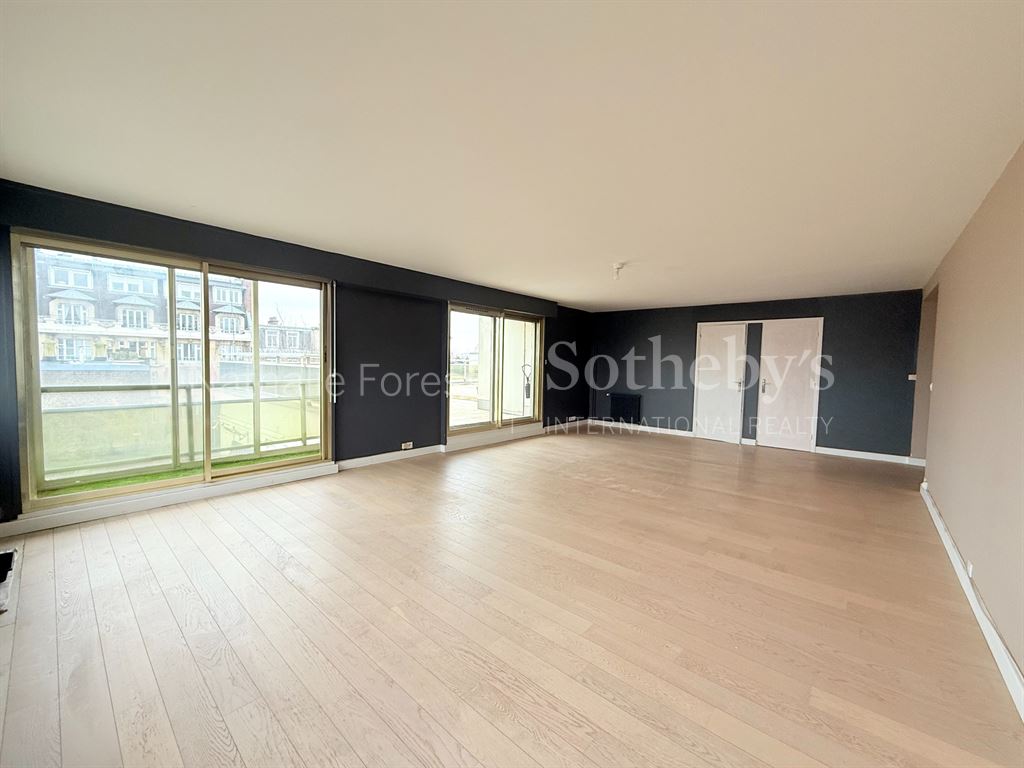 Dès l’entrée, les volumes et la luminosité séduisent. Celle-ci s’ouvre sur un superbe espace de réception d’environ 40 m², entièrement parqueté et baigné de lumière grâce à ses multiples ouvertures offrant de larges vues sur le quartier.