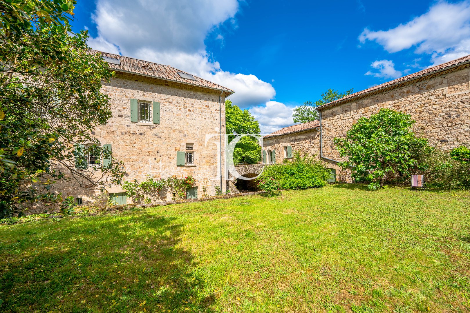 Cette propriété de plus de 5 hectares se compose de trois bâtis en grès, dont un corps principal de 330 m². La maison allie authenticité et confort moderne : caves voûtées, cuisine médiévale, piscine chauffée et sécurisée, et pièces de vie au cachet exceptionnel (cheminée, plafond à la française, dallage du XIIe siècle).