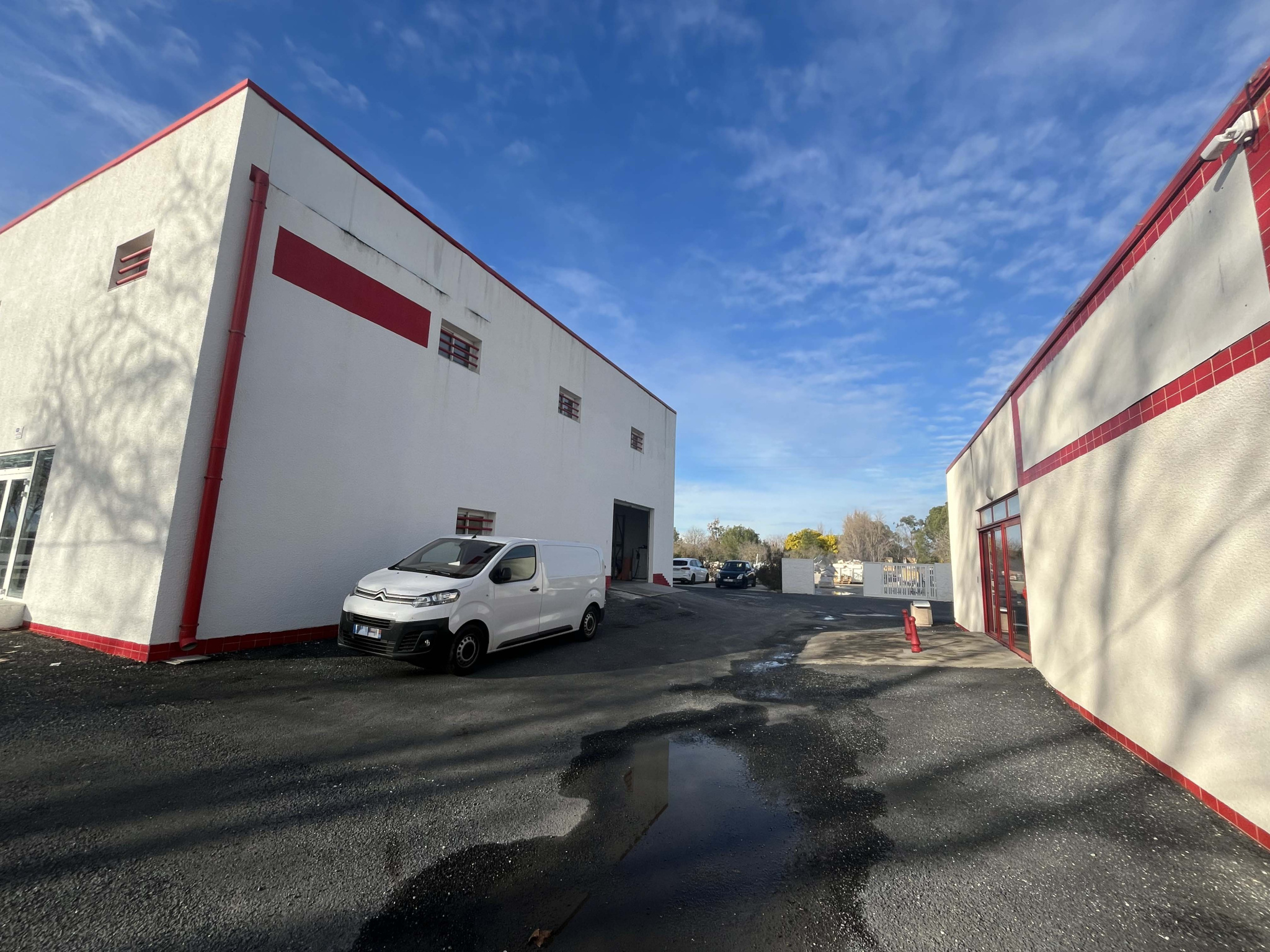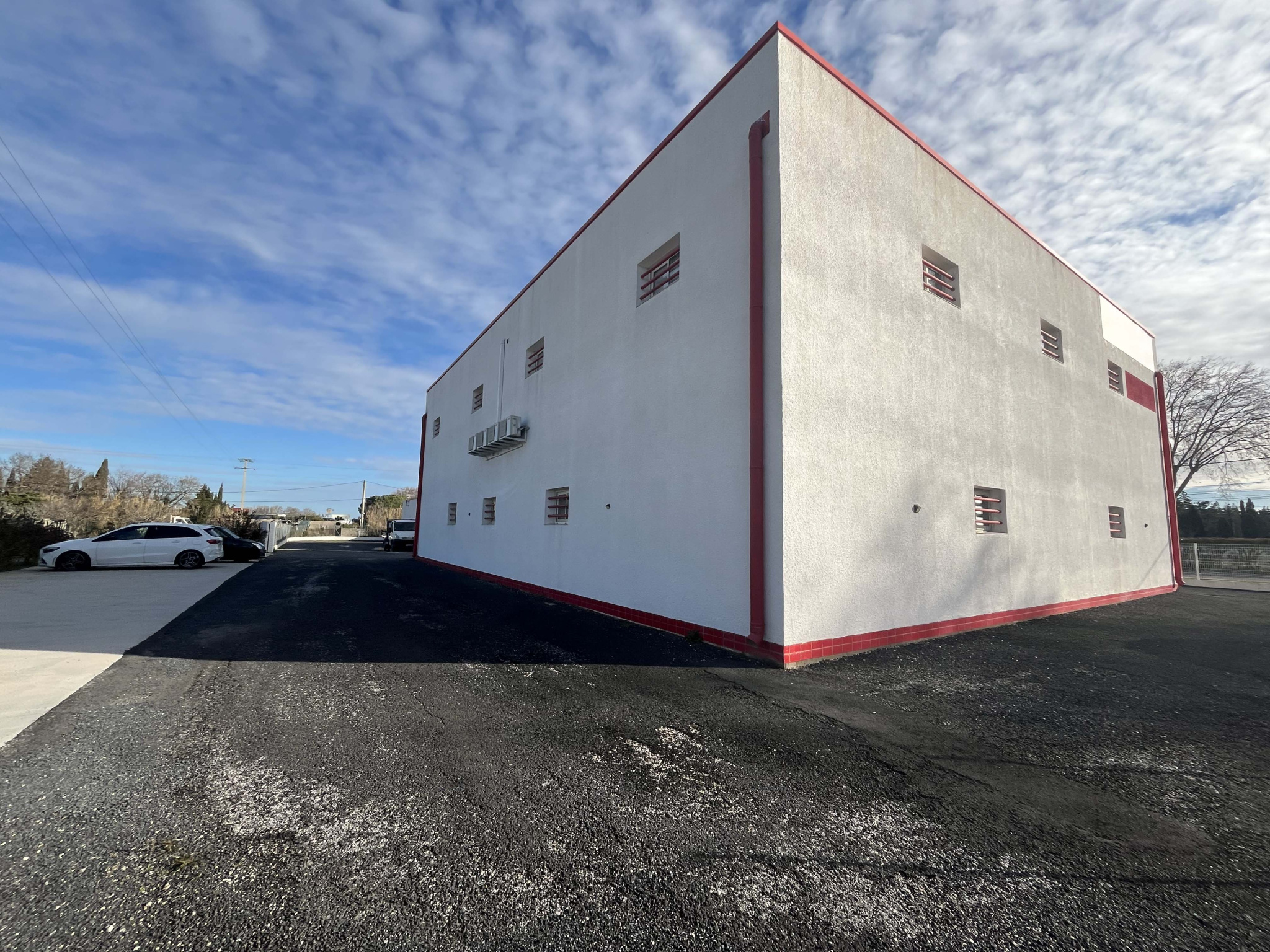 Implanté sur un grand terrain clôturé, l'ensemble se compose de deux bâtiments indépendants et de nombreuses places de stationnements