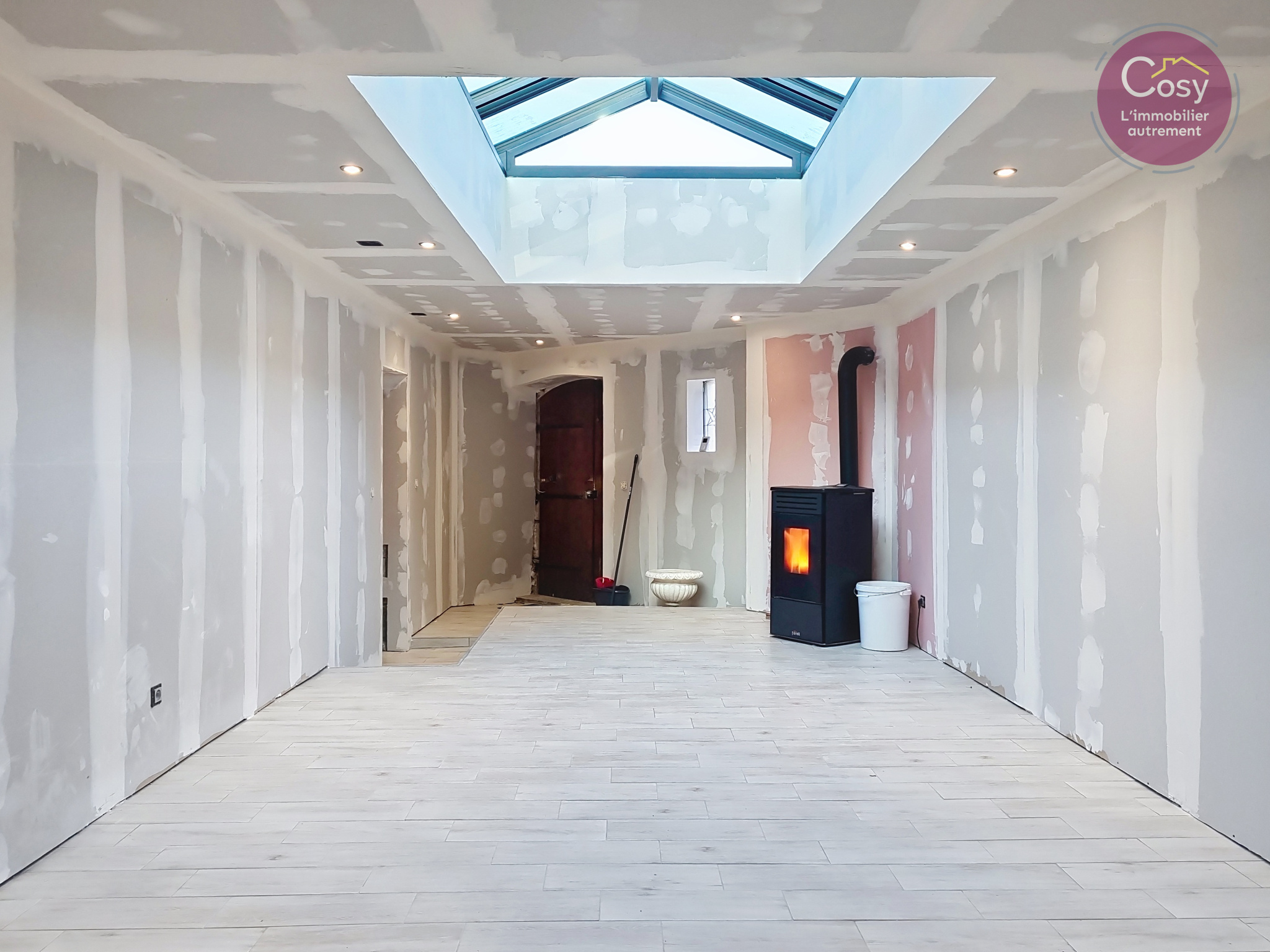 On y découvre une pièce de vie chaleureuse avec cheminée double foyer, prolongée par un salon attenant, pouvant facilement être transformé en chambre de plain-pied. Le patio vitré, équipé d'un poêle à granulés, crée une atmosphère lumineuse et inspirante -- parfaite pour un espace détente, un atelier créatif ou un salon.